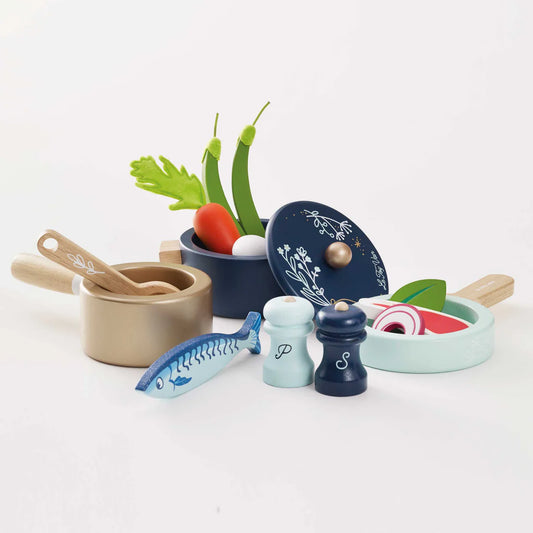Fine Motor Skills: Handling small wooden utensils, pots, and food items helps children improve their dexterity and hand-eye coordination. These skills are crucial for tasks such as writing and self-care activities.