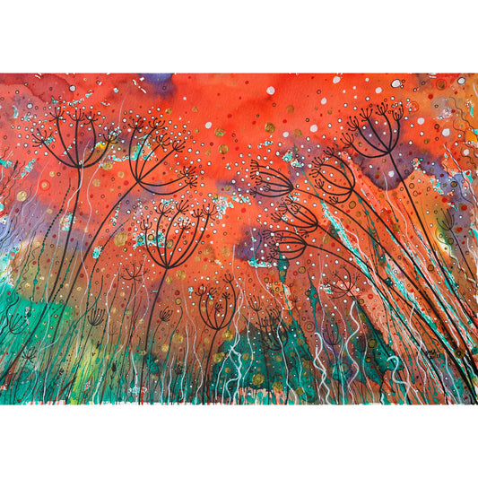 Oranges and reds, vivid and bright, Drench the artwork in pure delight.