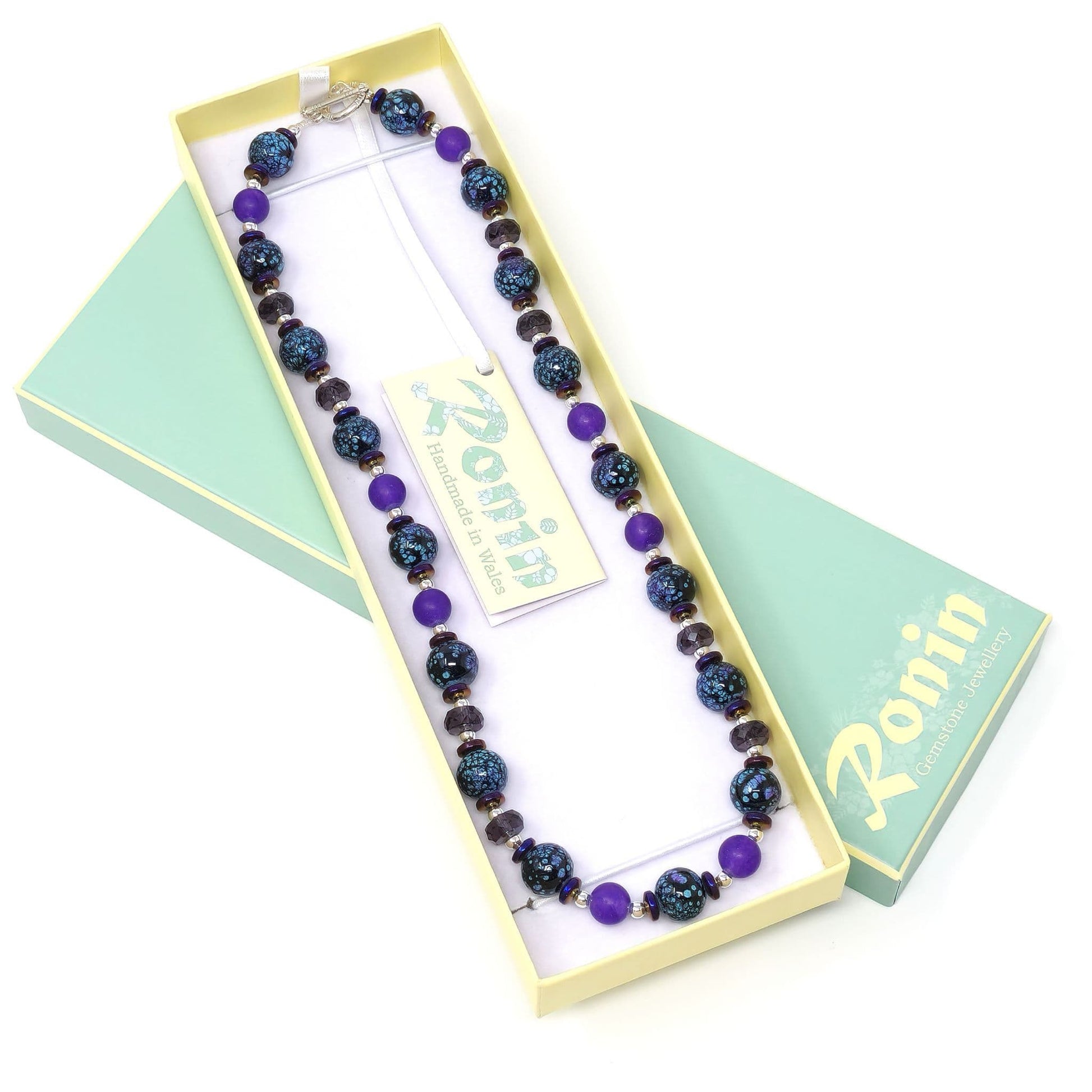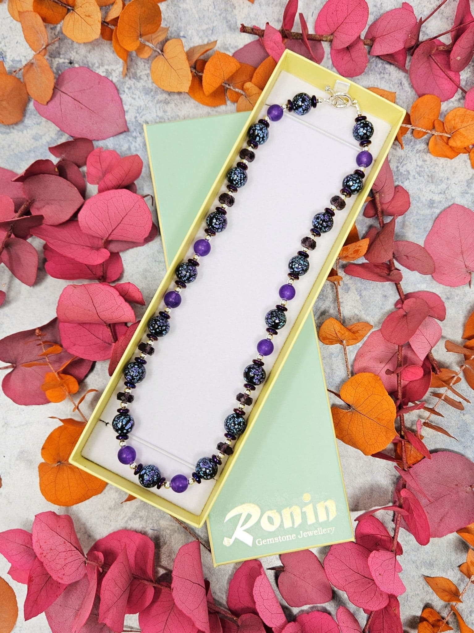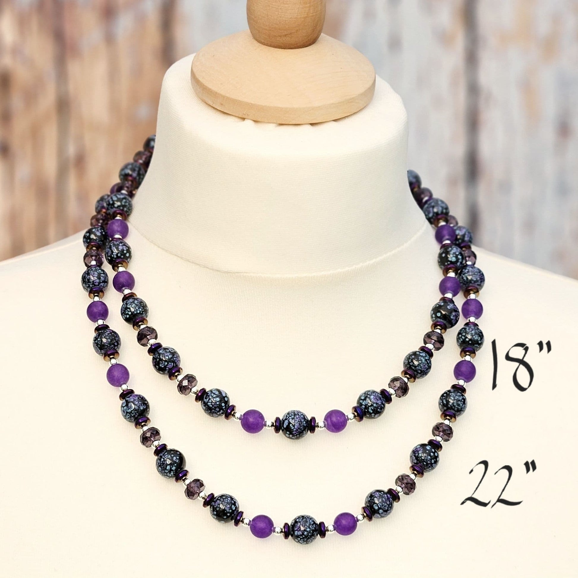 Purple semi-precious gemstones, with a frosted finish, alongside beautiful glass beads & crystal rondelles.