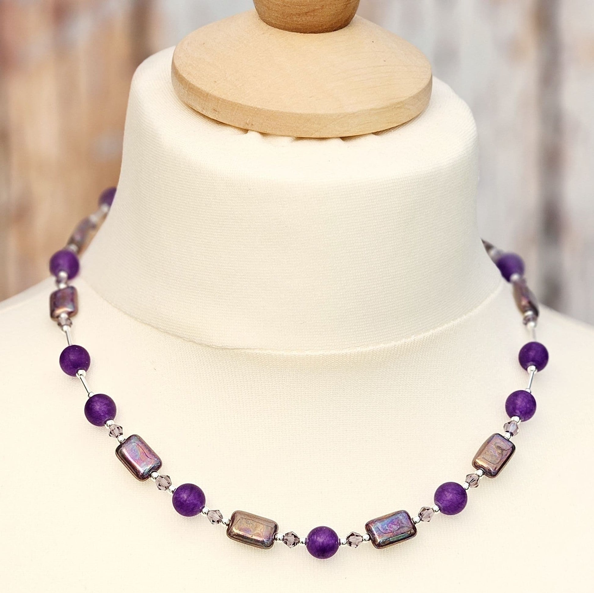 Purple semi-precious gemstones, with a frosted finish, alongside beautiful glass beads & crystal rondelles.