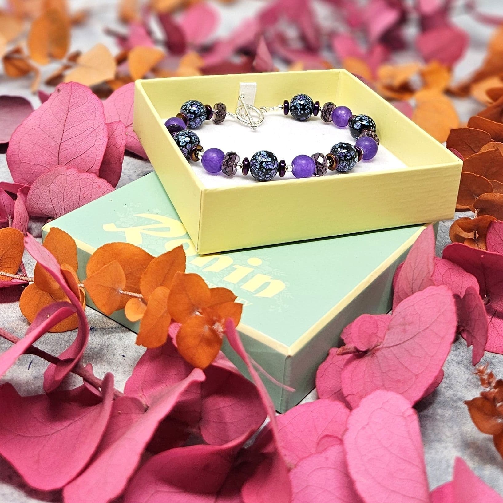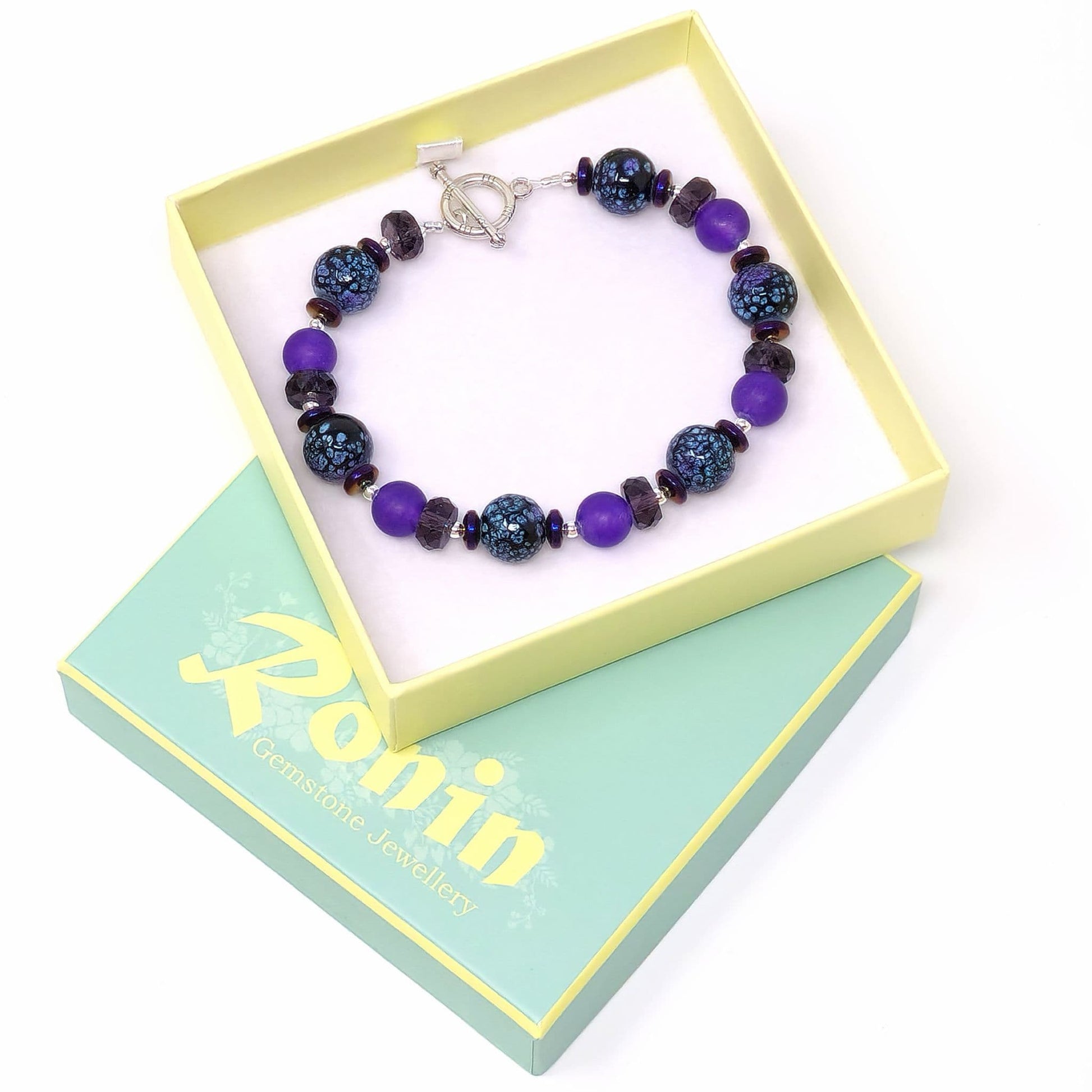 Purple semi-precious gemstone beads, with glass beads & plated Agate gemstones..