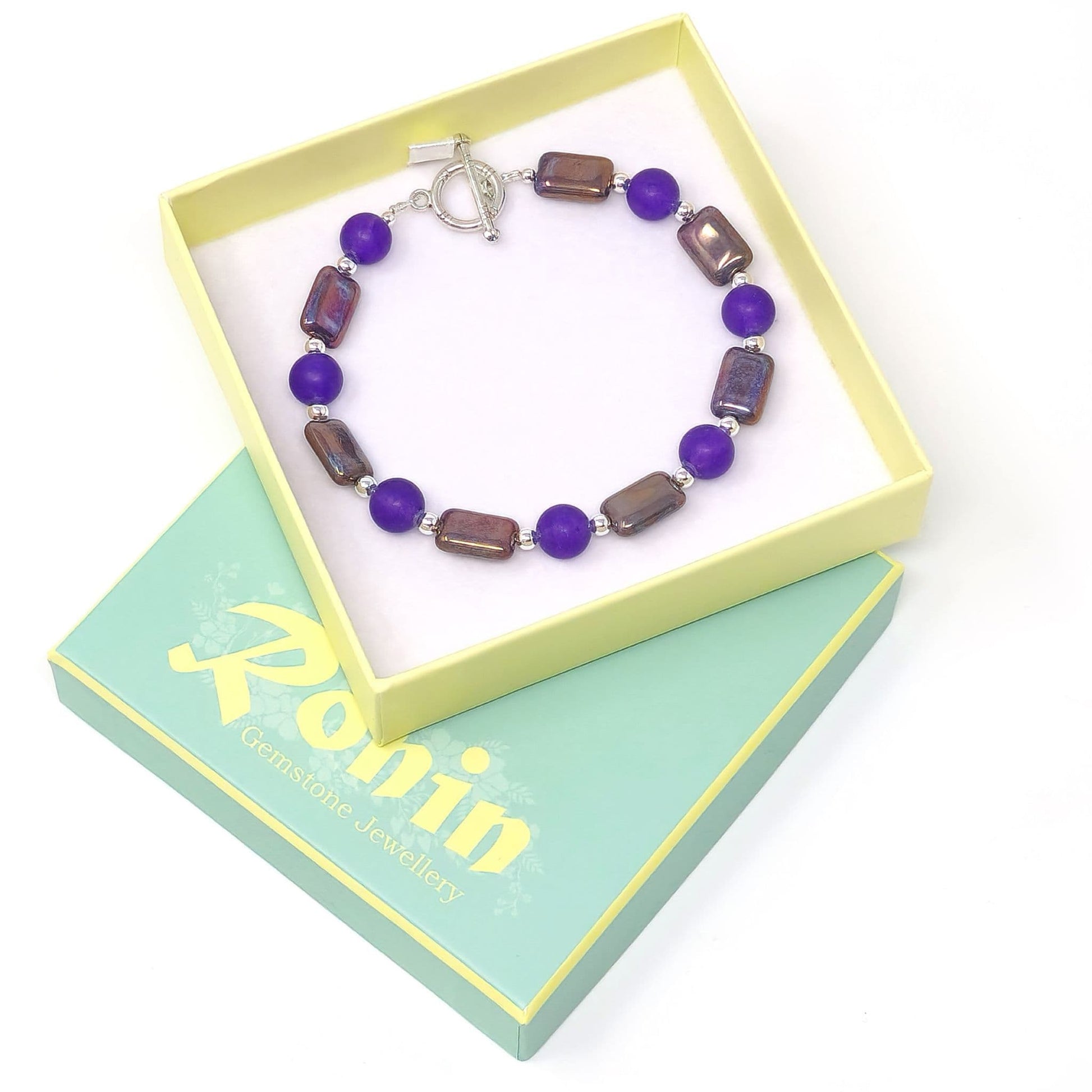 Purple semi-precious gemstone beads, with a frosted finish, alongside glass beads.