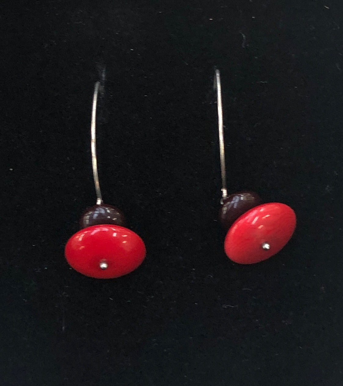 SOREN earrings are made of two light saucer-shaped pieces of Tagua vegetable ivory, mounted on a long hook made of sterling silver.