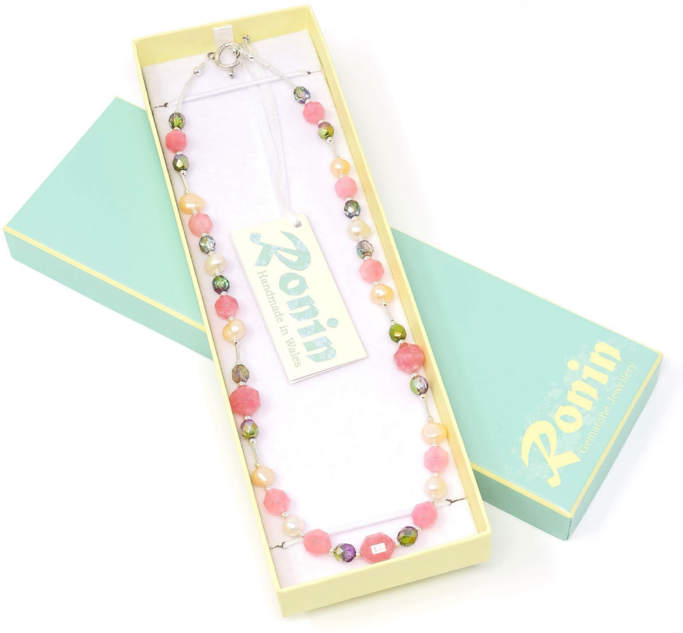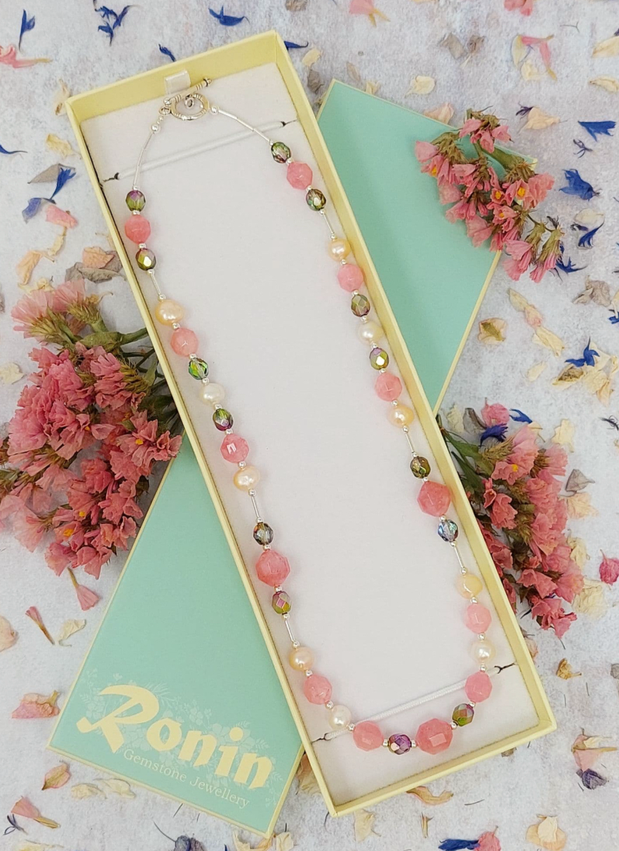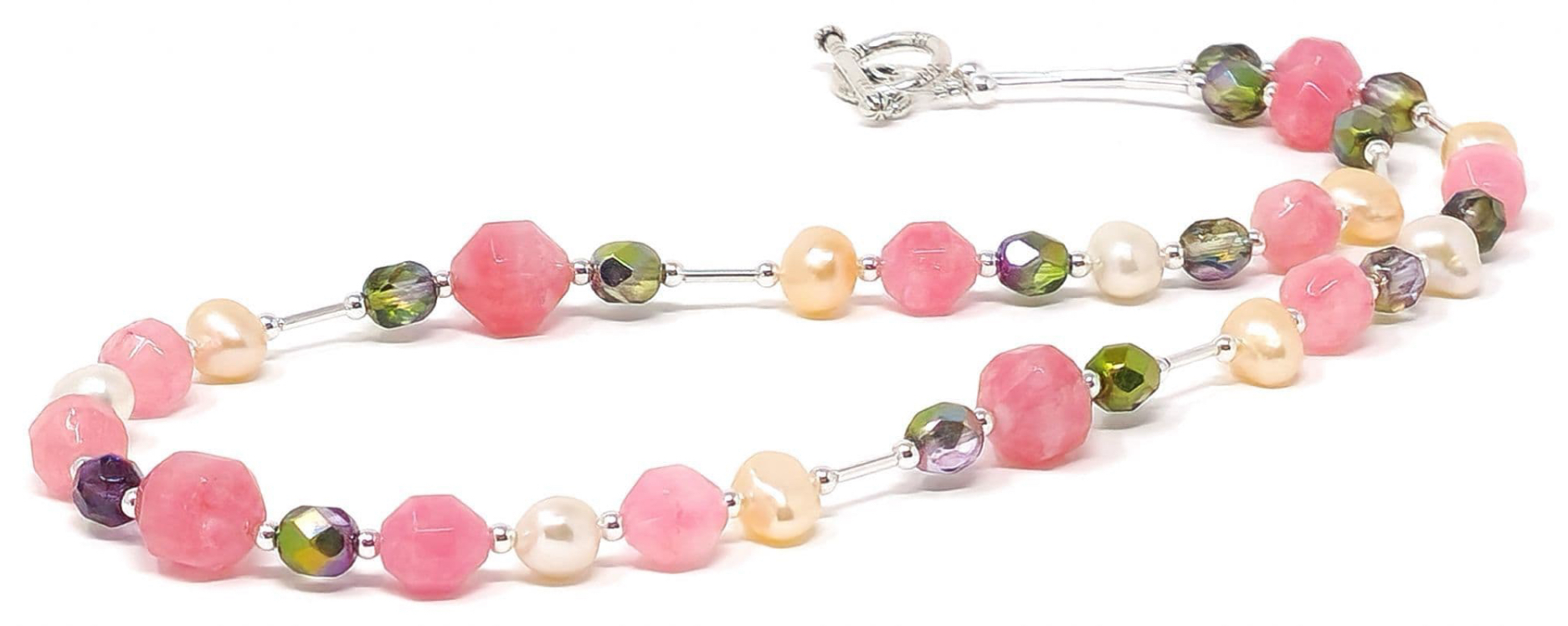 Chalcedony gemstone beads are combined with Freshwater Pearls and crystal beads.