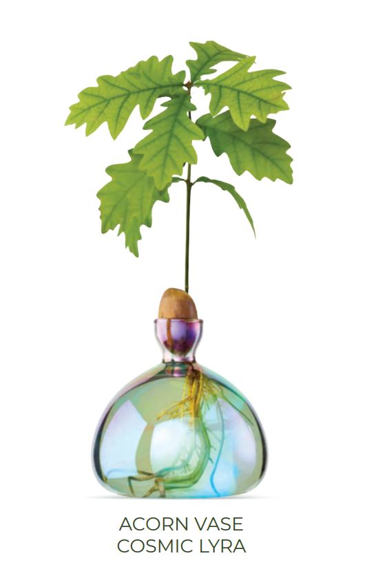 Designed by Ilex Studios to observe a simple acorn as it matures into a magnificent oakling. The spherical body and narrow neck designs of the acorn vase hold the acorn in place as it rests above the water, whilst the twisting roots grow and spread decoratively in the vessel below and the oak's iconic leaves sprout above. Simply add water, keep the root moist, and see the magic of nature unfold before your eyes.