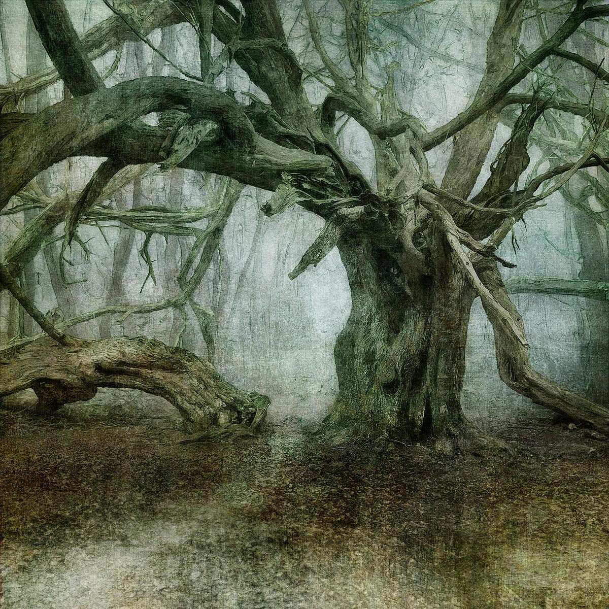 One of the ancient Yew trees emerges from an eeire mist at Kingley Vale in West Sussex. Two in a triptych - please see 148 and 158