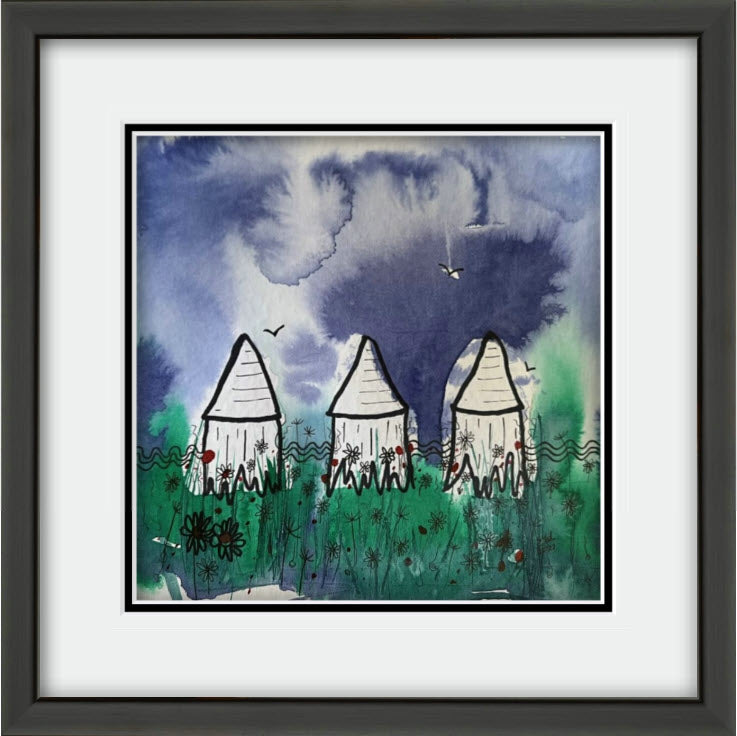 Description - In this serene painting, gulls gracefully soar above a picturesque coastal scene with charming beach huts nestled amidst a vibrant chervil meadow.