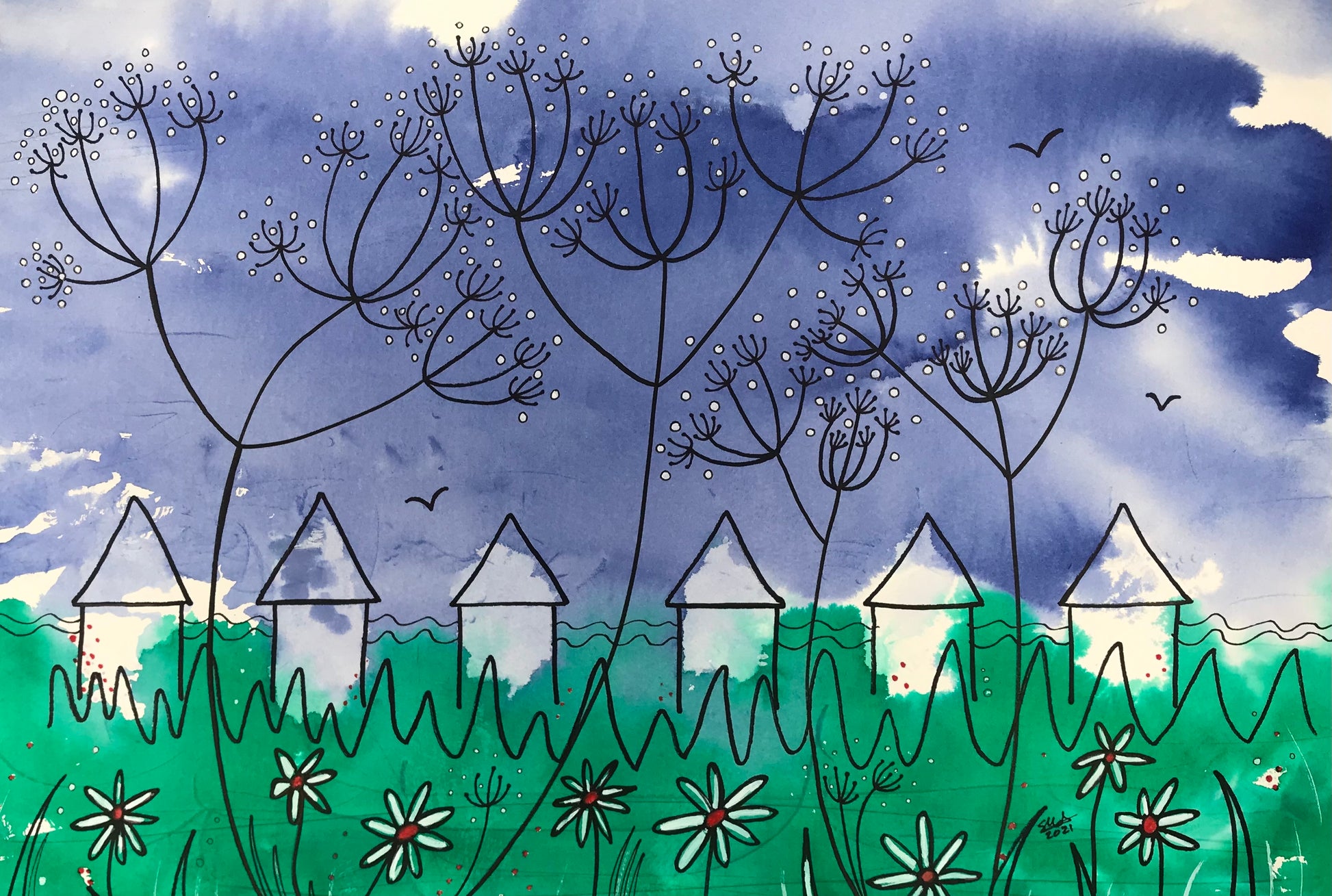 Abstract huts amidst the wildflowers, Stand against time’s fleeting hours.
