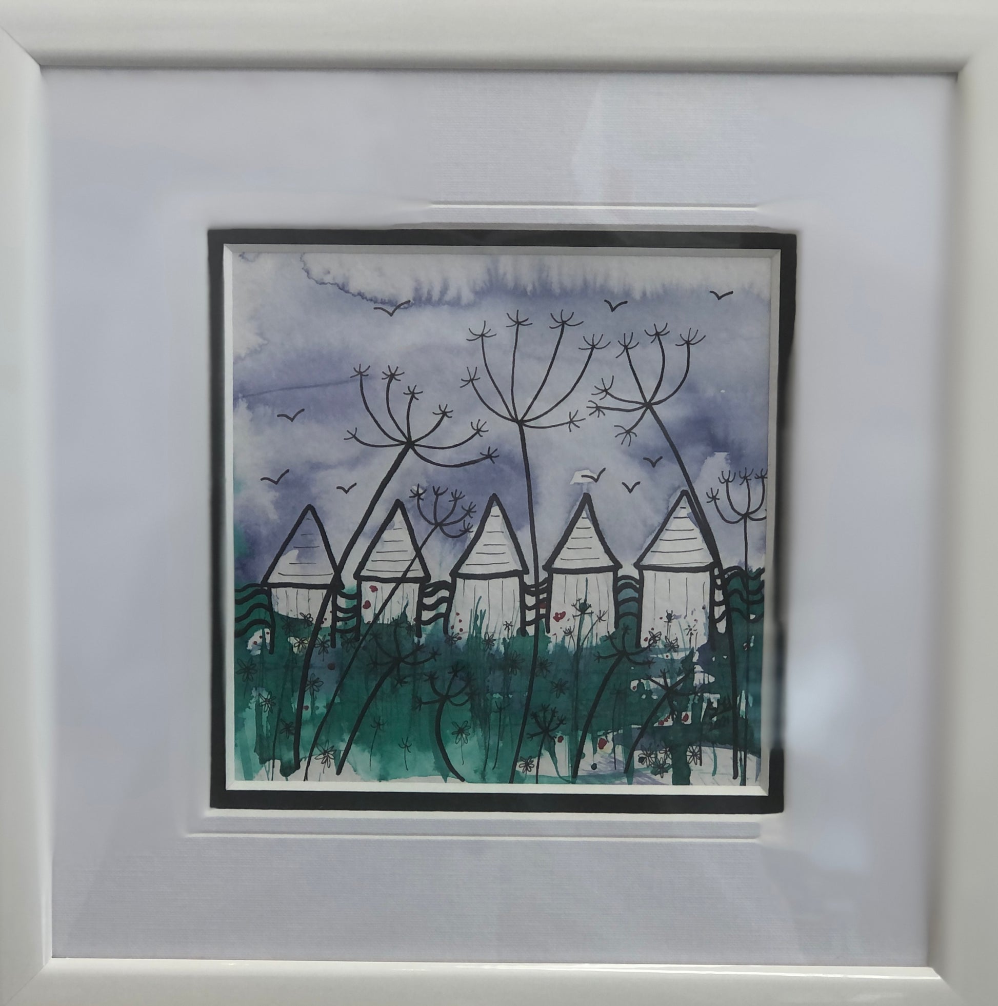 Description - Gulls soaring above the beach hut sisters