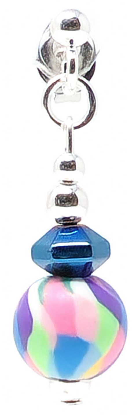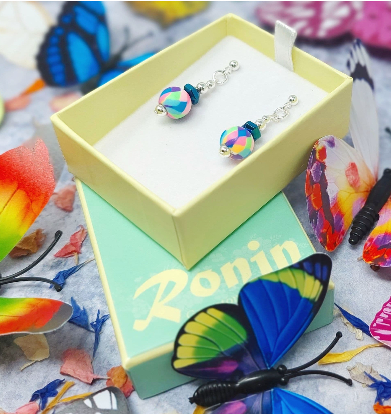 Colourful patterned Polymer clay beads with Haematite bead above.