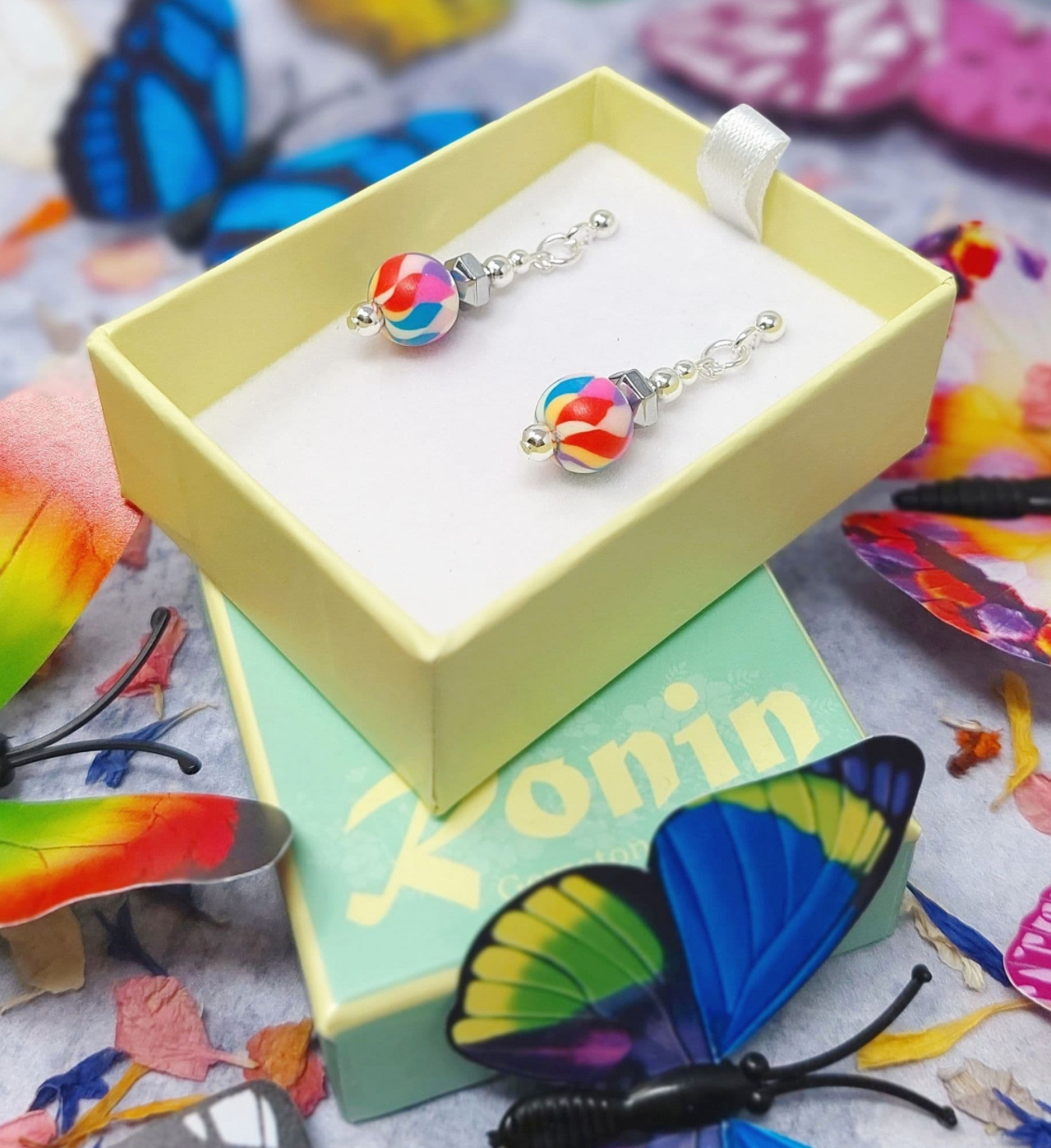 Colourful patterned Polymer clay beads with Haematite bead above.