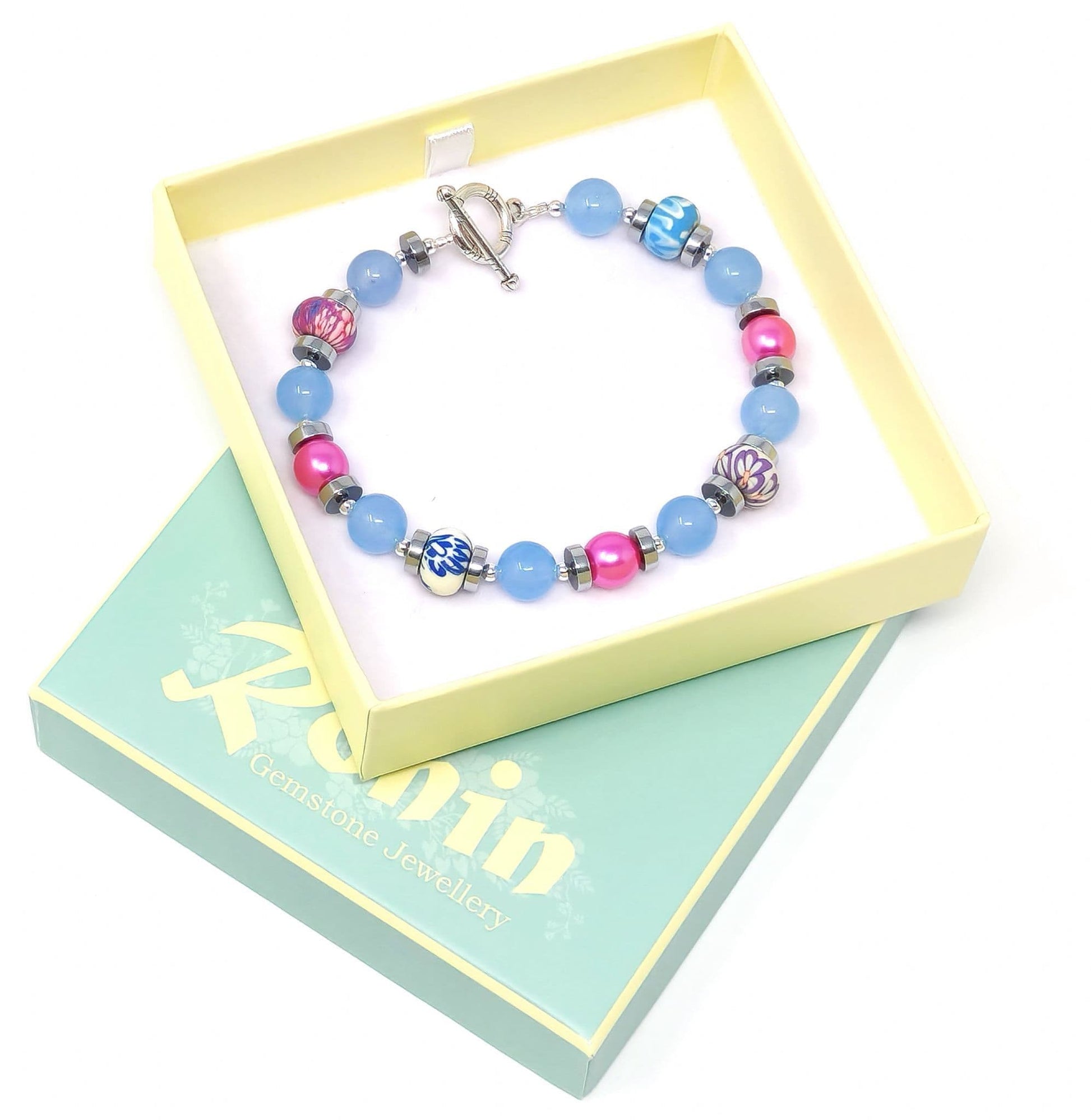 An eye-catching colour combination of blue & pink, with gemstones combined with decorative, patterned beads.