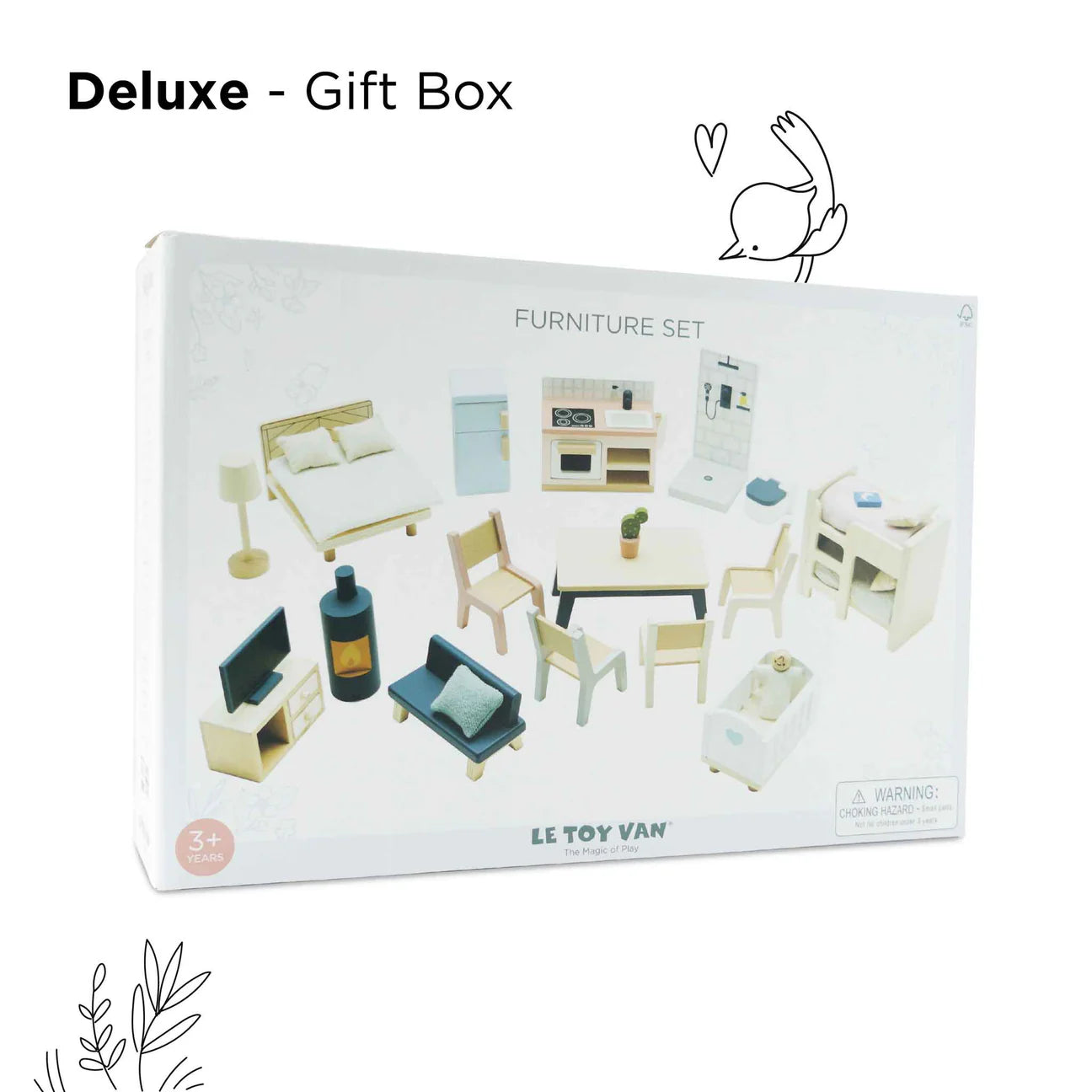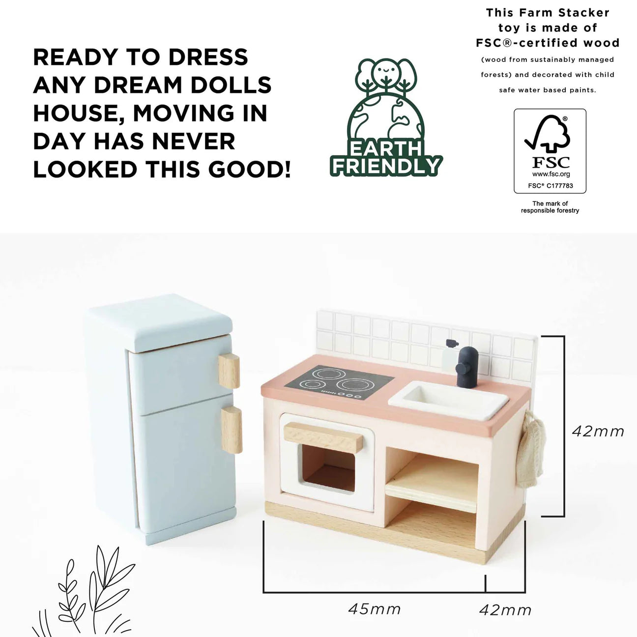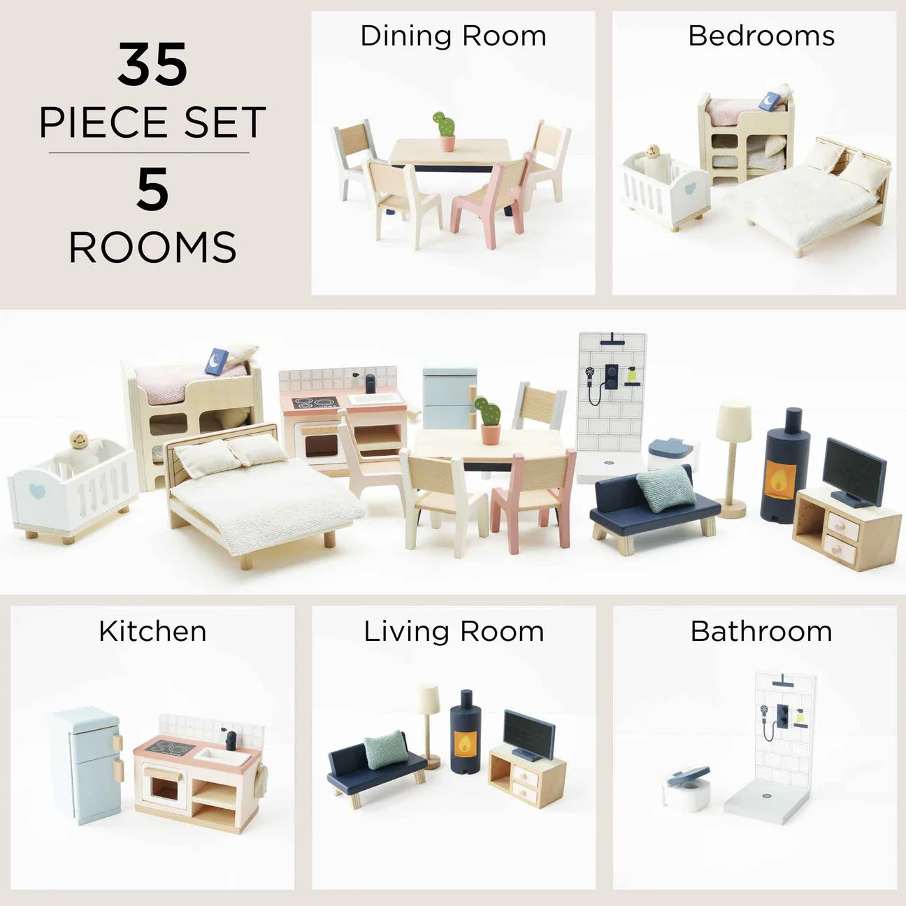 Furnish your miniature play universe with this absolutely stunning 35 piece furniture set. Ready to dress any dream home, moving in day has never looked this good. Each high quality piece is crafted from FSC® - certified wood, for long lasting, planet friendly play. Featuring natural soft tones and lots of exposed wood, add instant style to your little ones dolls house with this amazing starter set which includes a kitchen, living room including log burner, bedroom, shower room, plus dining table and chairs. Compatible with our full range of beautiful wooden dolls houses and accessories.