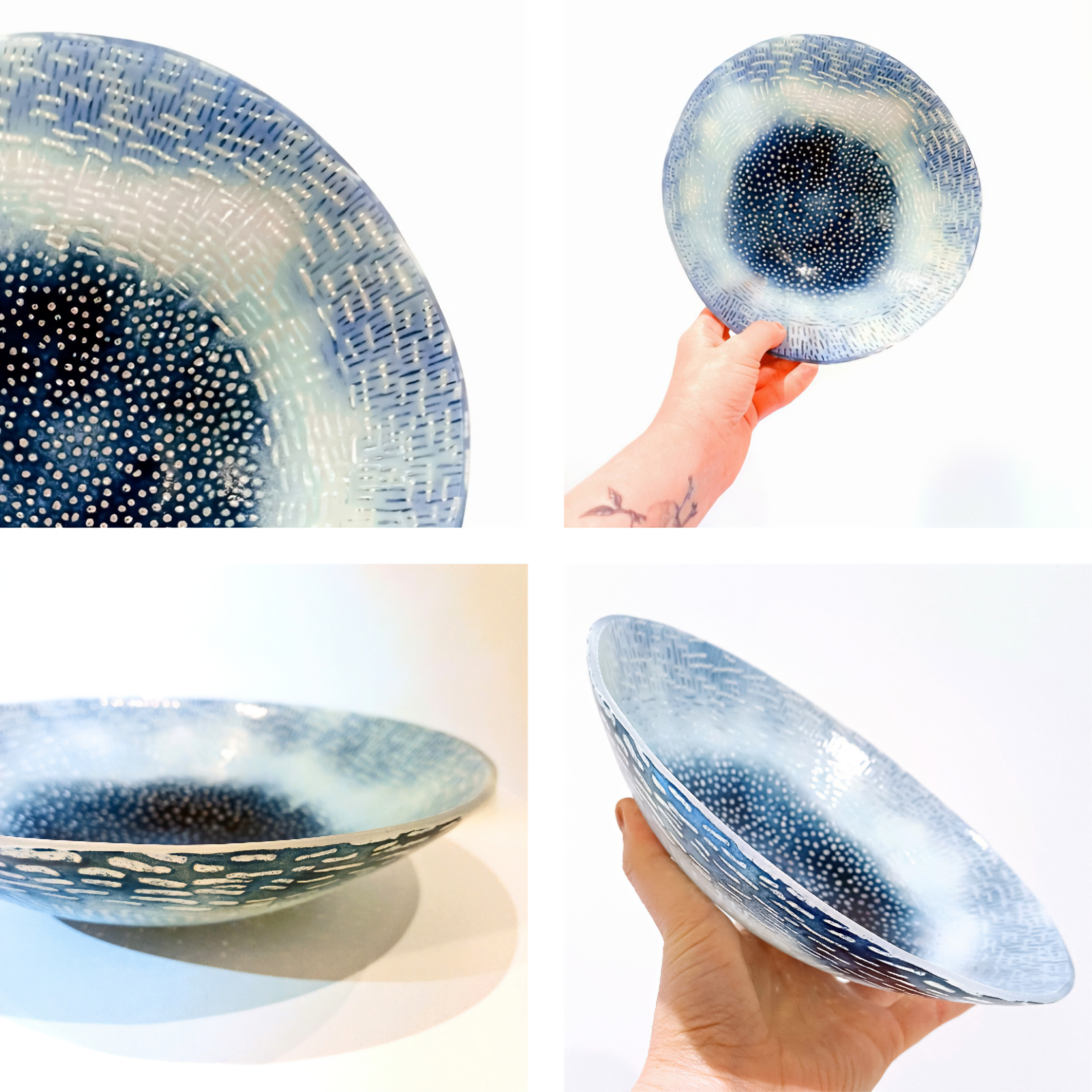 Opposing marks and colours on the two side of this vessel scatter light in dots and shards. This is the good bit of winter, where the dusk is velvet blue and flecked with the twinkle of fairy lights and mornings are crisp and sharp.