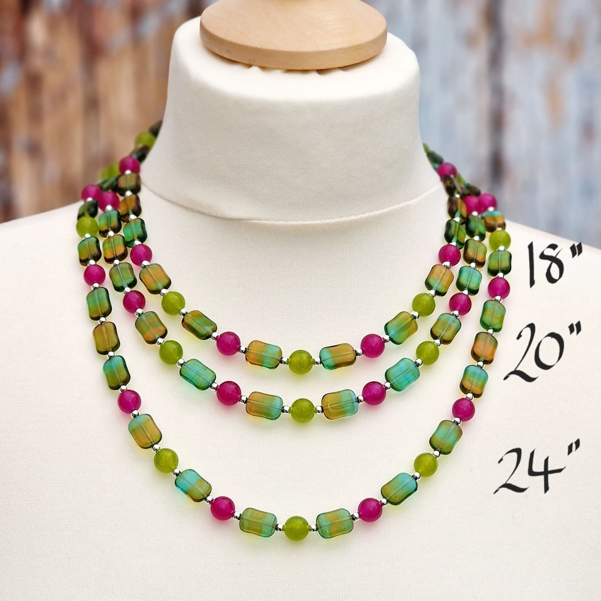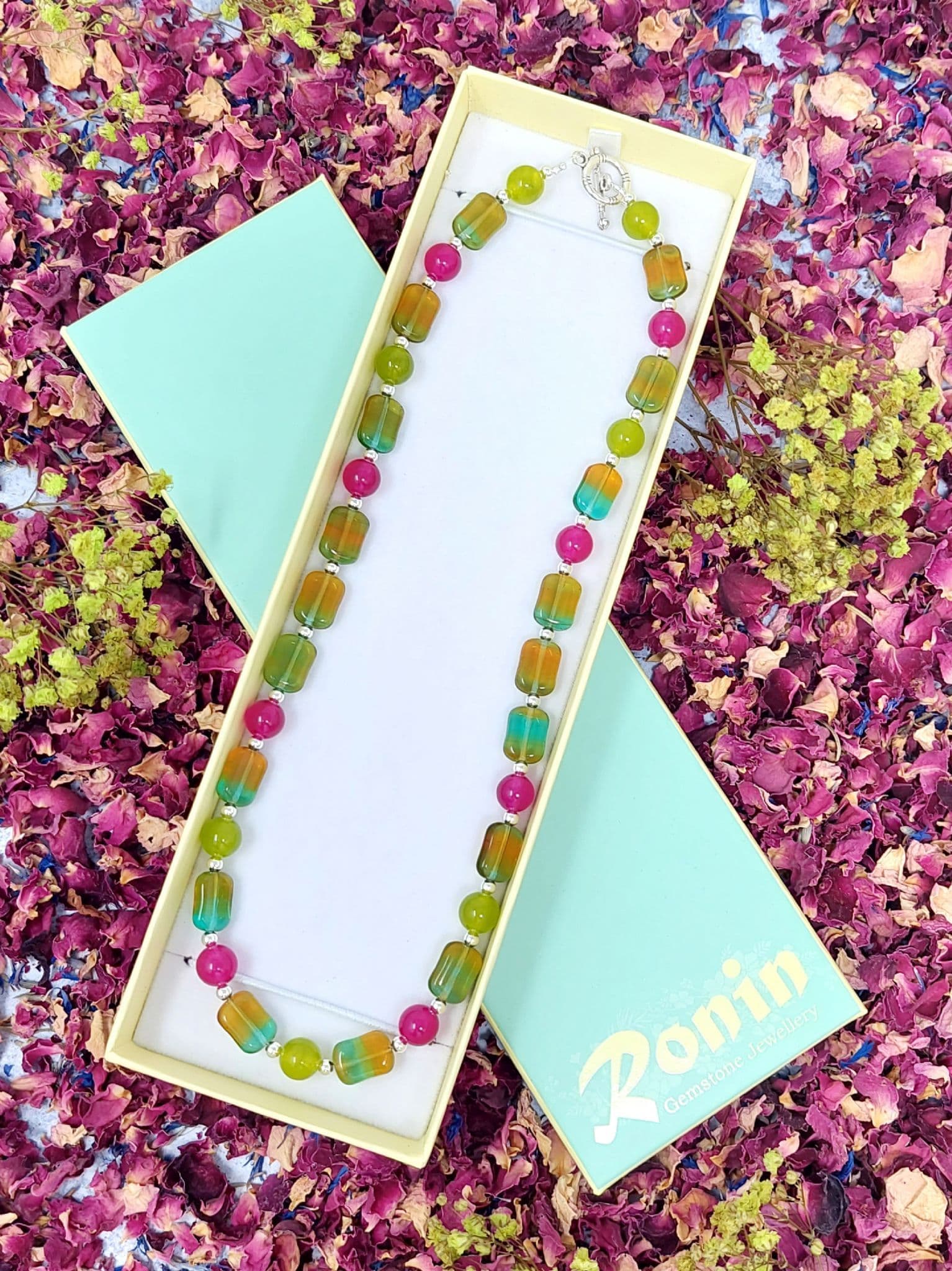 Round dyed Chalcedony gemstone beads in 2 colours are combined with pretty glass beads.