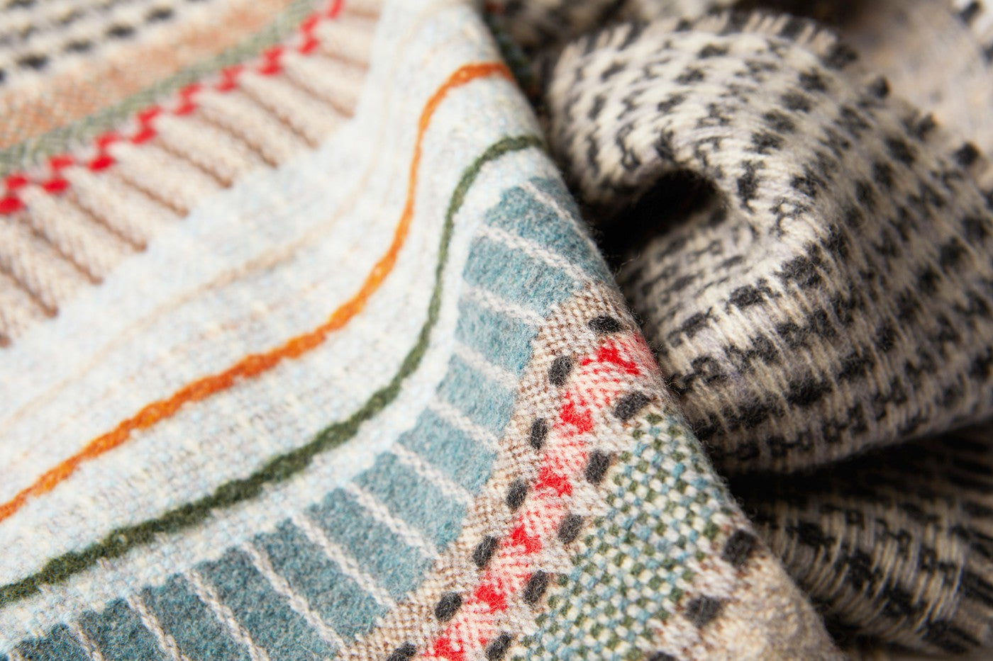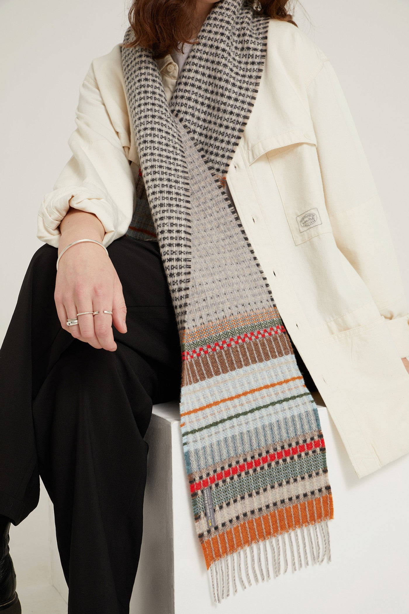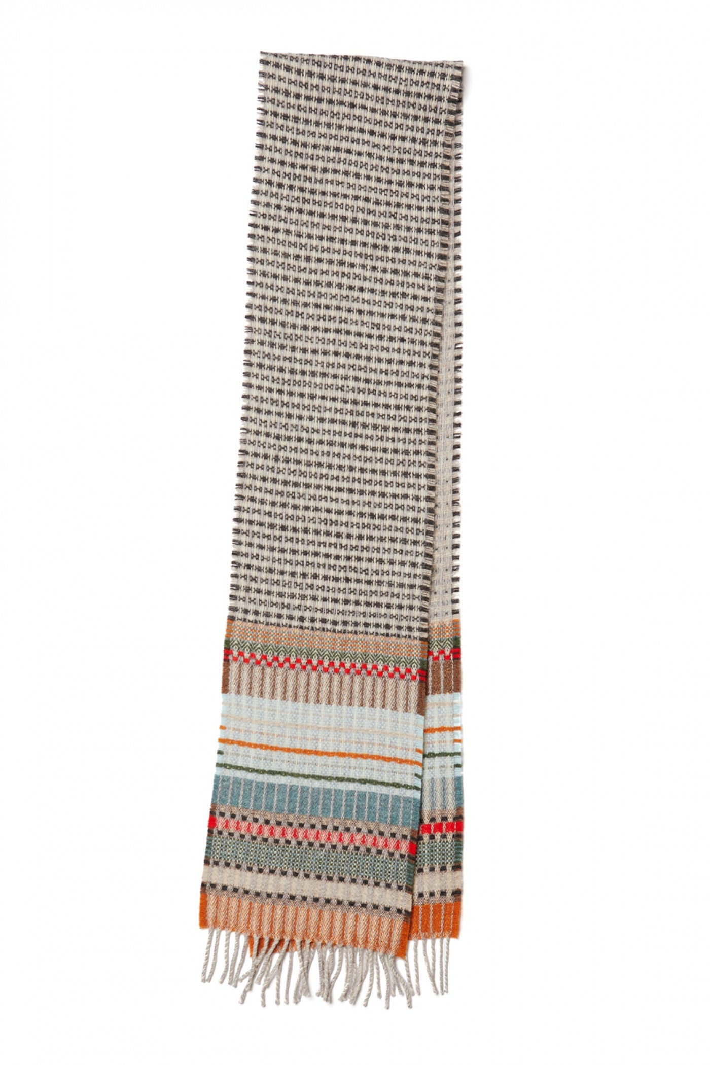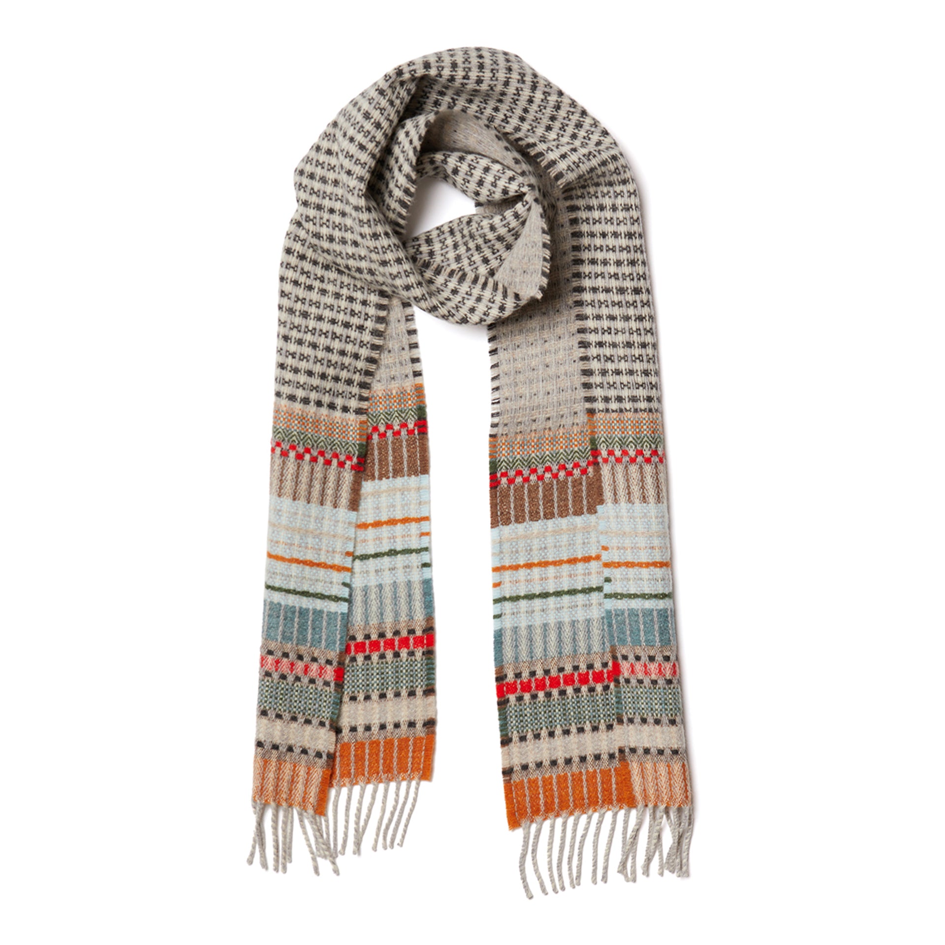 A woven symphony of pattern and texture runs throughout this cosy merino lambswool scarf. It features a reversible central section giving the wearer multiple options.