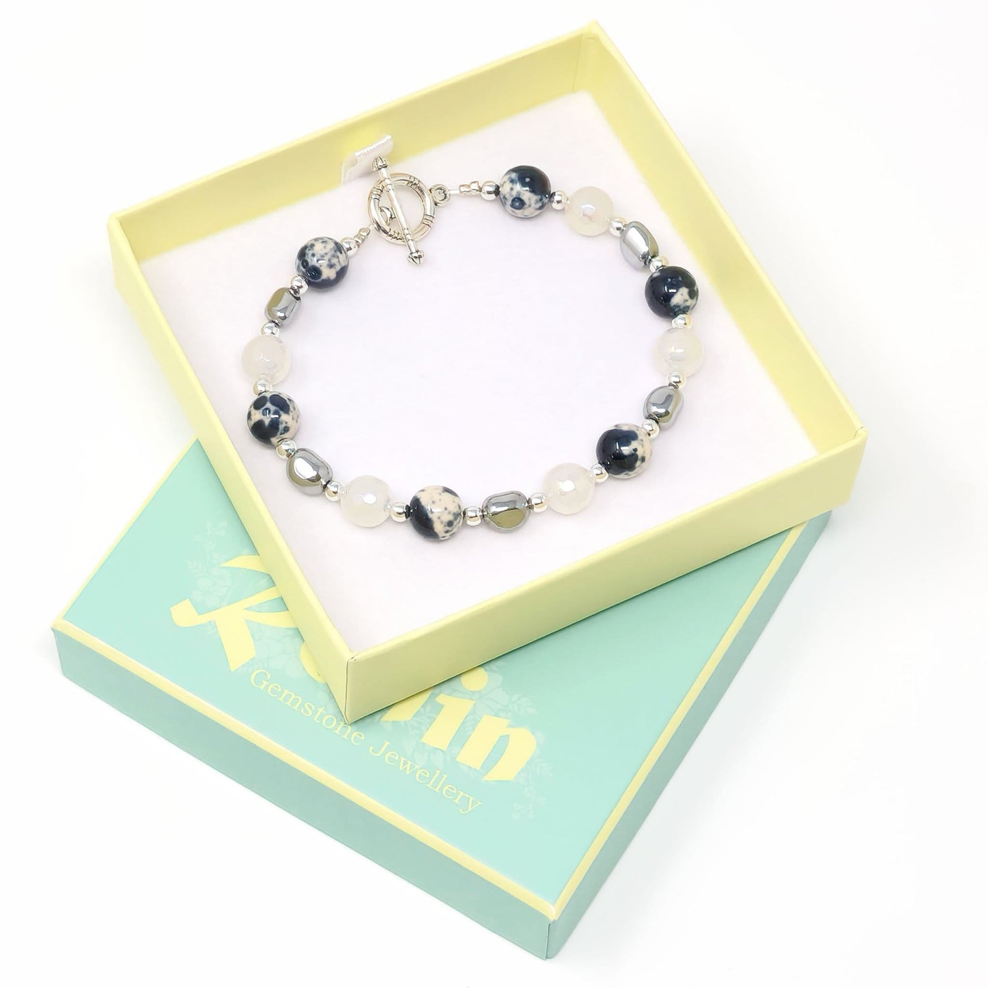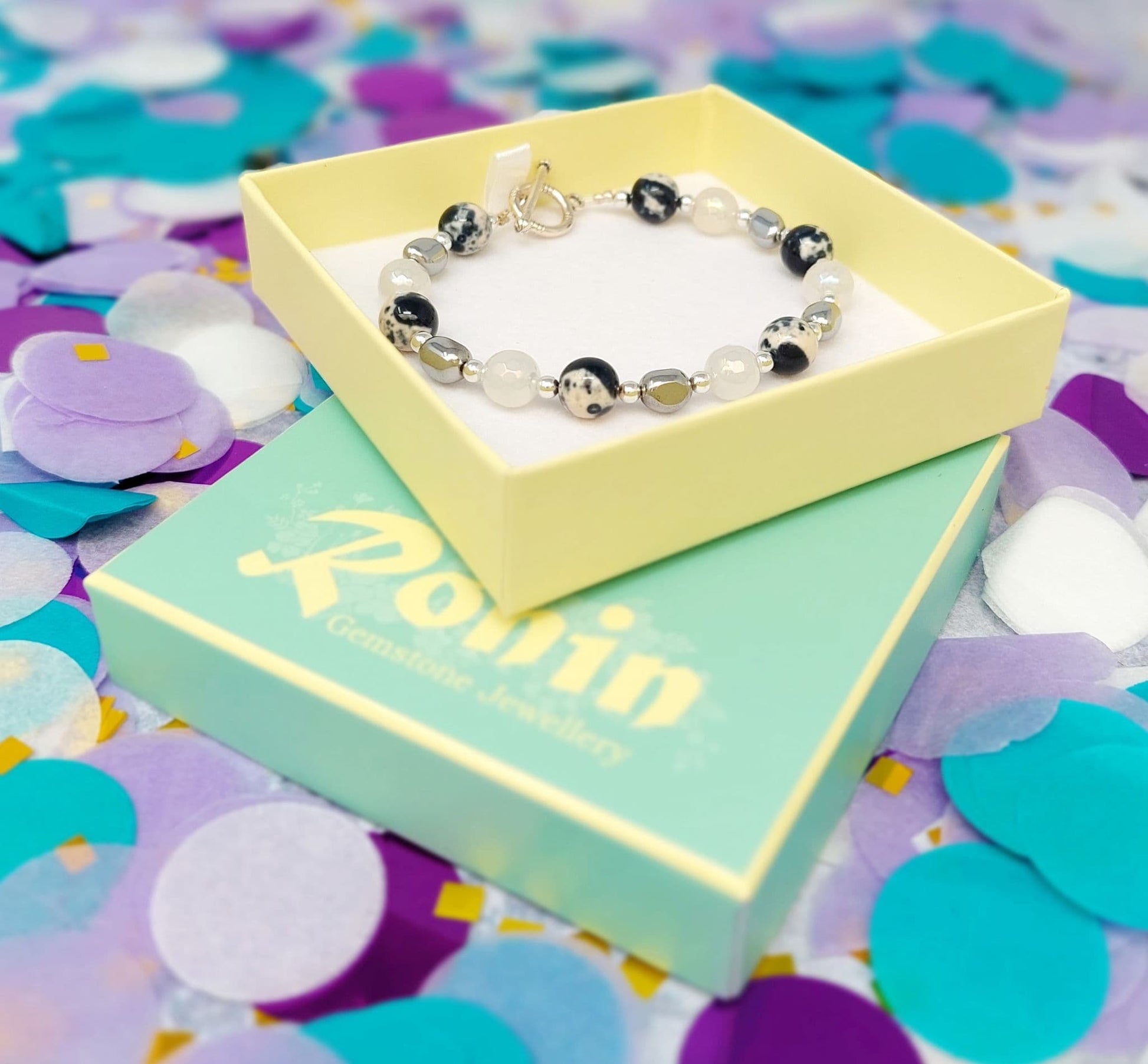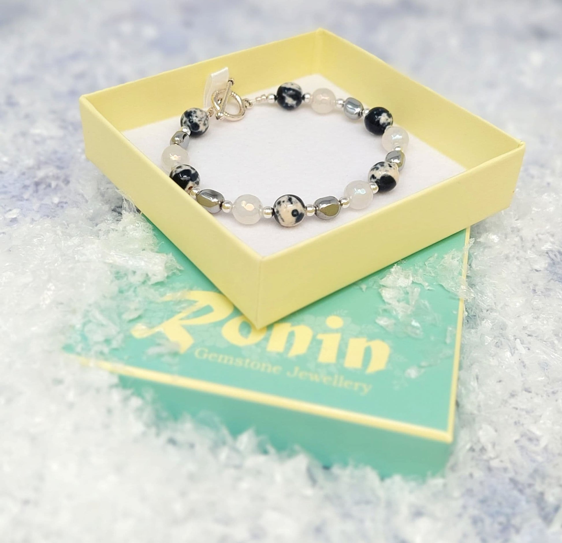Electroplated faceted Agate gemstones, Haematite & patterned Jasper. Thanks to the electroplating the white Agate gemstones have a subtle, but beautiful, shimmer.
