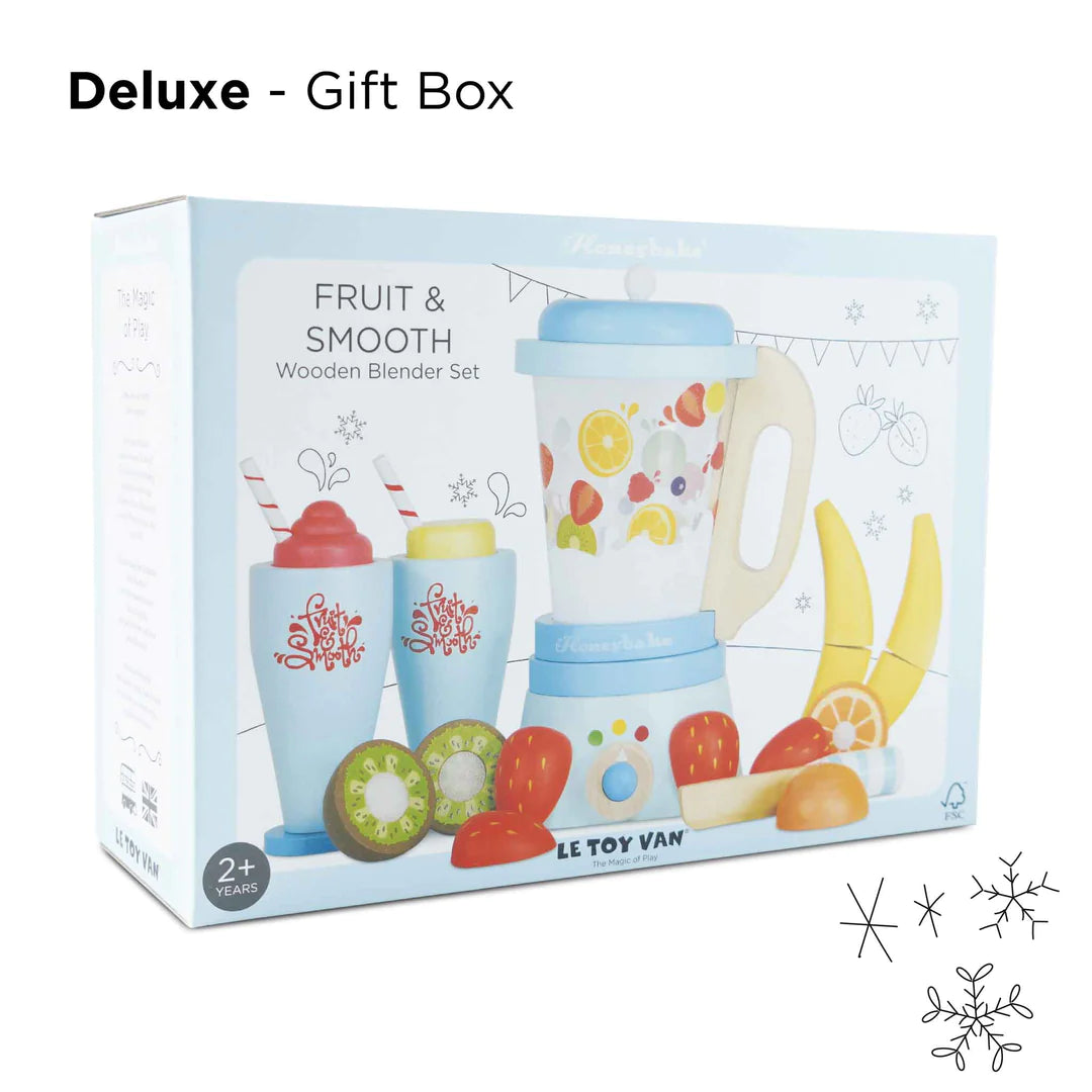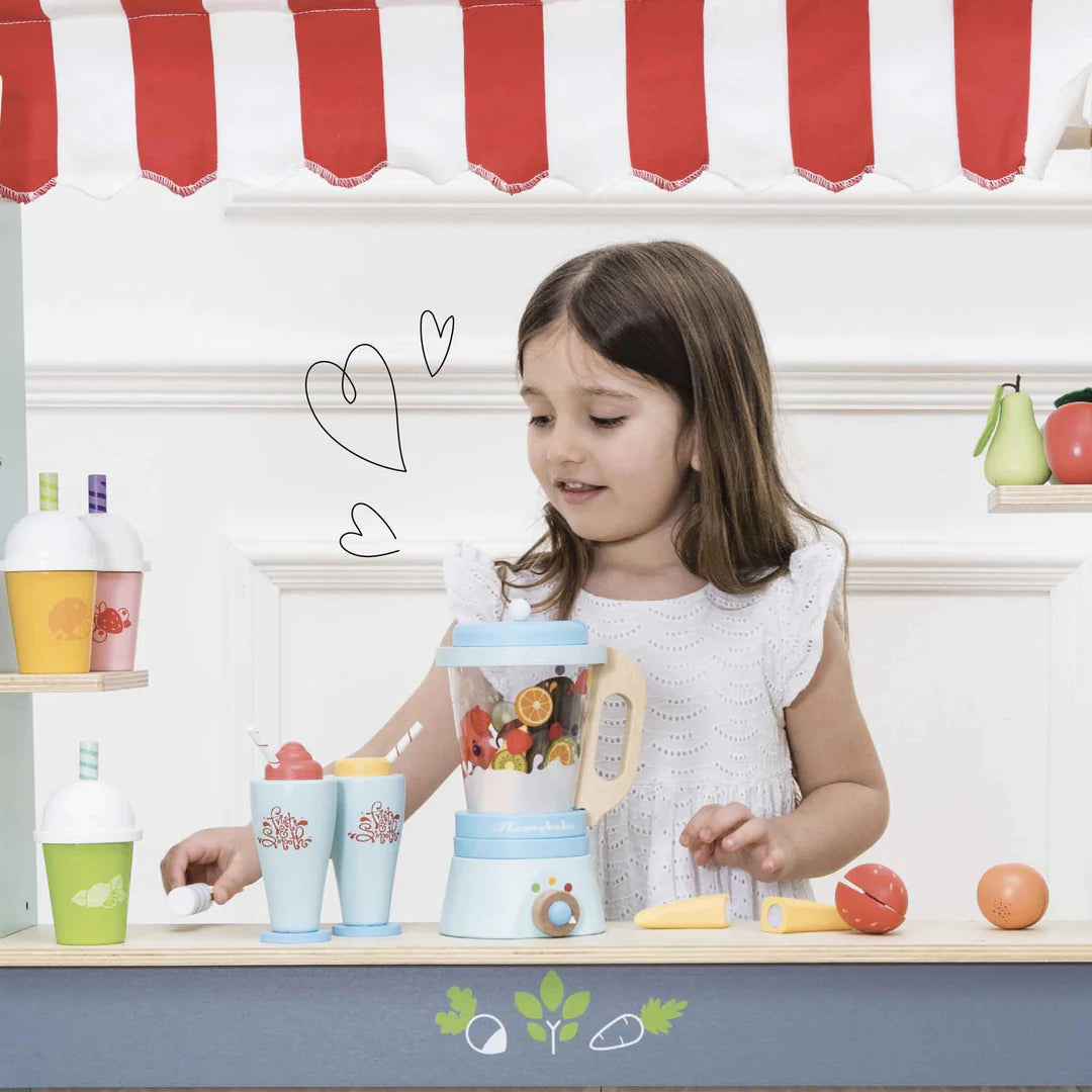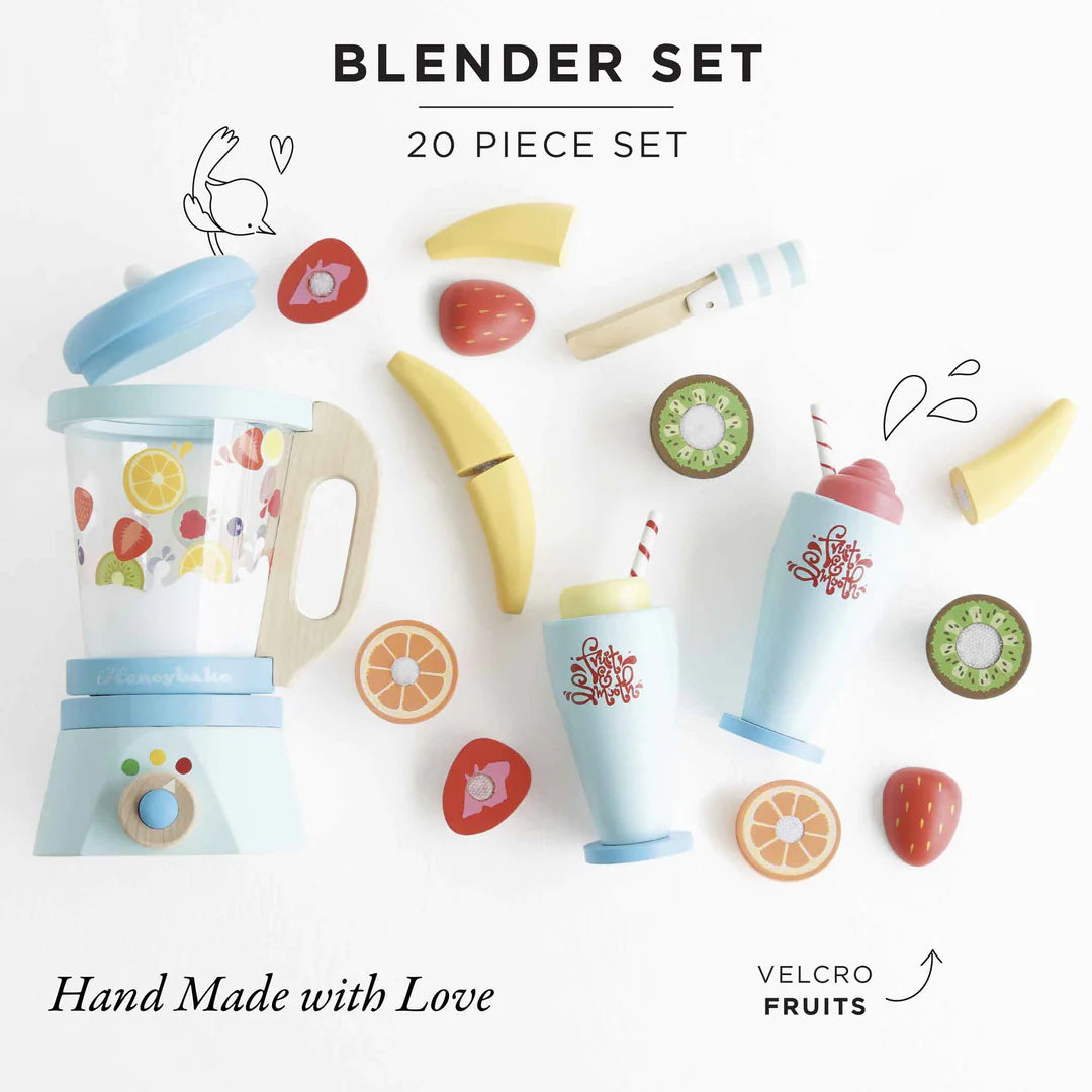 Featuring a retro style blender with a detachable jug, 6 sliceable fruits, a play knife and 2 wooden tumblers with removable toppings.