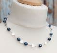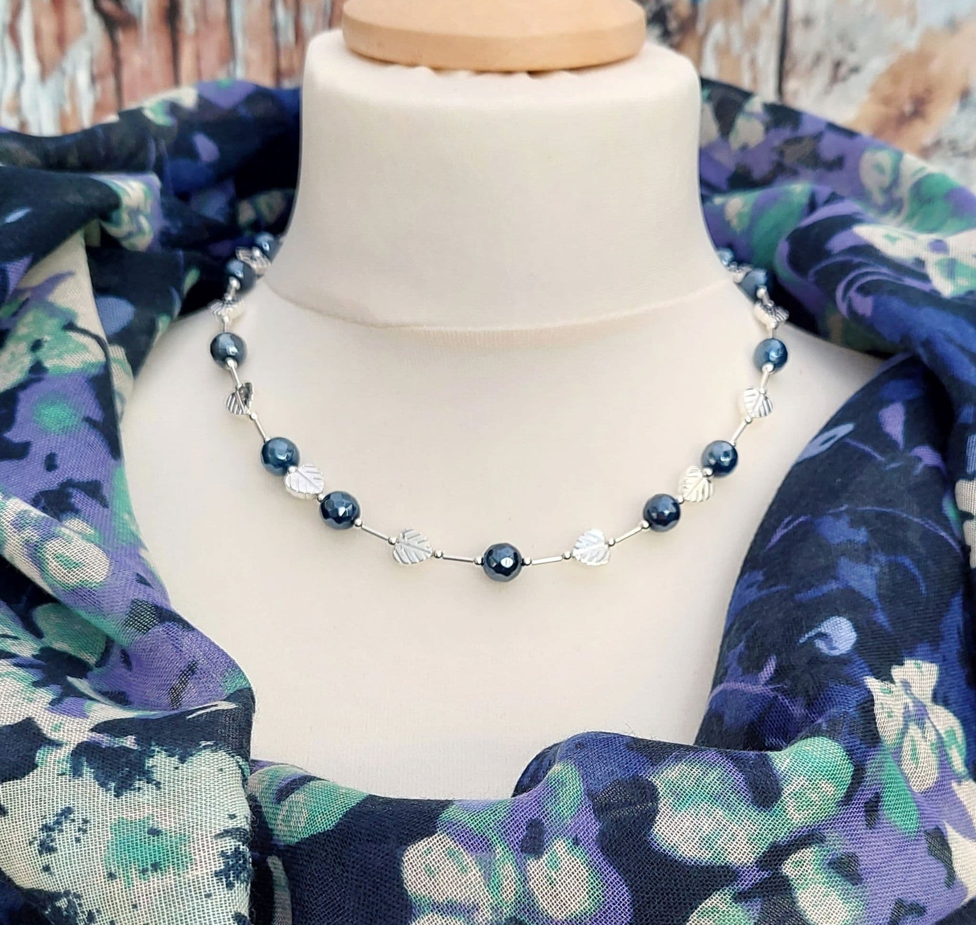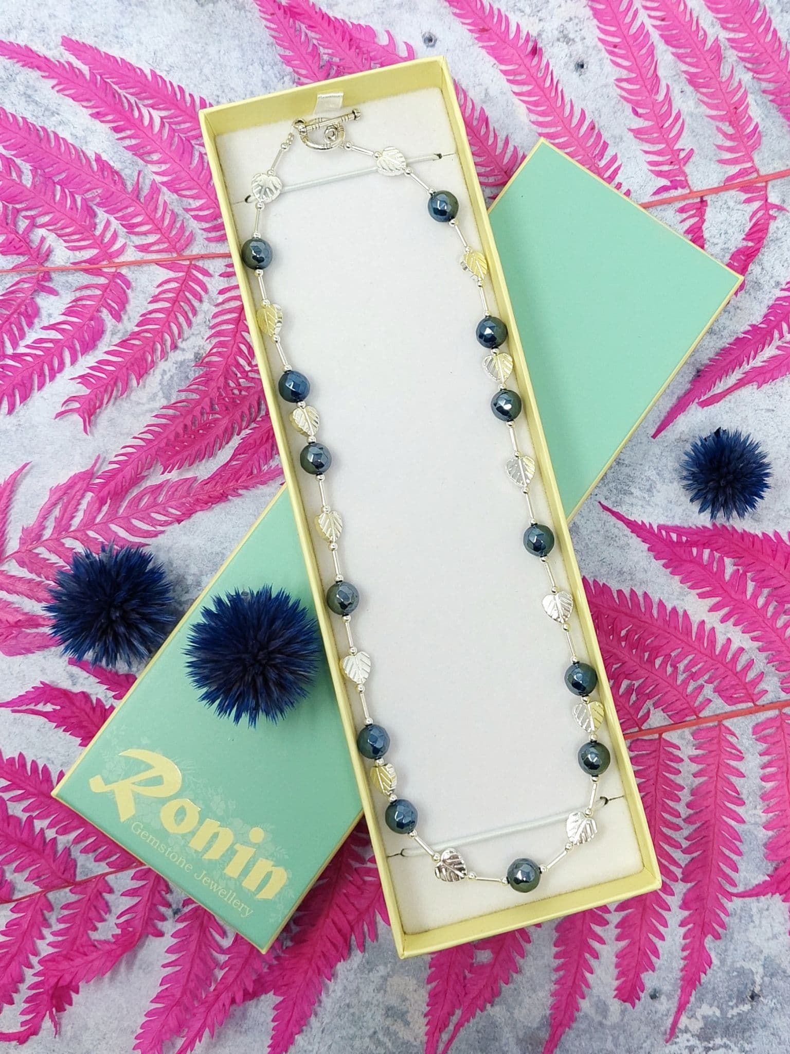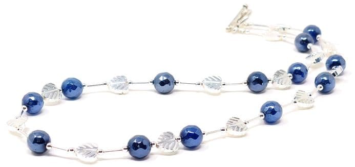 Dark blue faceted Agate gemstone beads are combined with silver coloured leaf shaped Haematite beads.