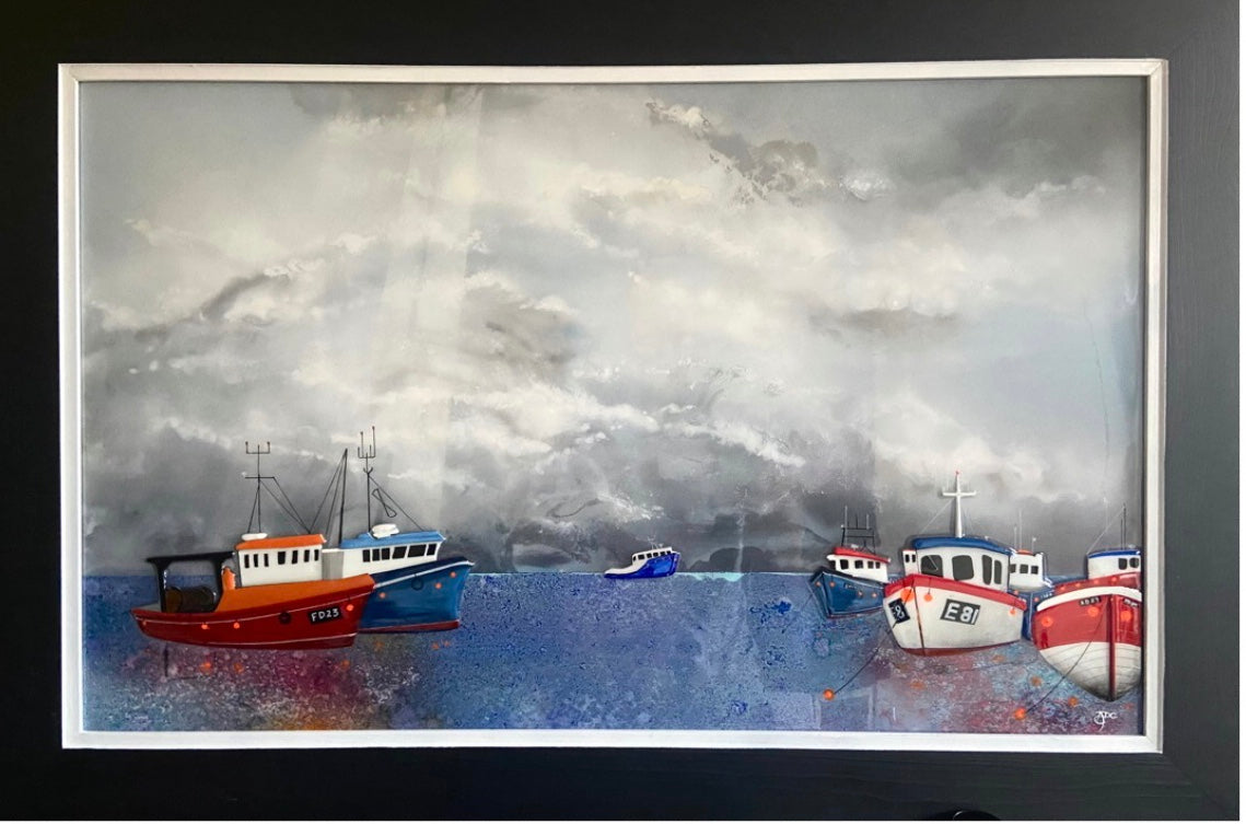 A group of fishing boats—each marked with its own identity—rests peacefully on a calm sea, their vibrant reds, blues, and whites standing out against the moody, cloud-laden sky.