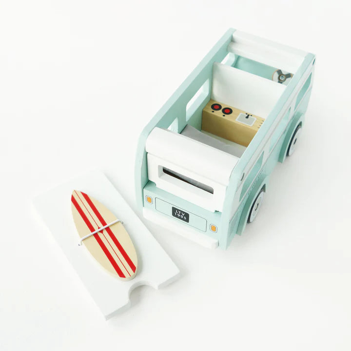 Sunny adventures beckon with this fun, retro style campervan. Solid and durable, this high quality toy is made, FSC® - certified wood and painted in a mix of blue, white and natural wood finish for an authentic vintage look. With a removable surfboard on the roof, this miniature home on wheels is fully equipped with a mattress, cooker and sink plus drivers section, ready for happy family holidays down by the sea. This toy is fully compatible with our range of dolls house doll families.