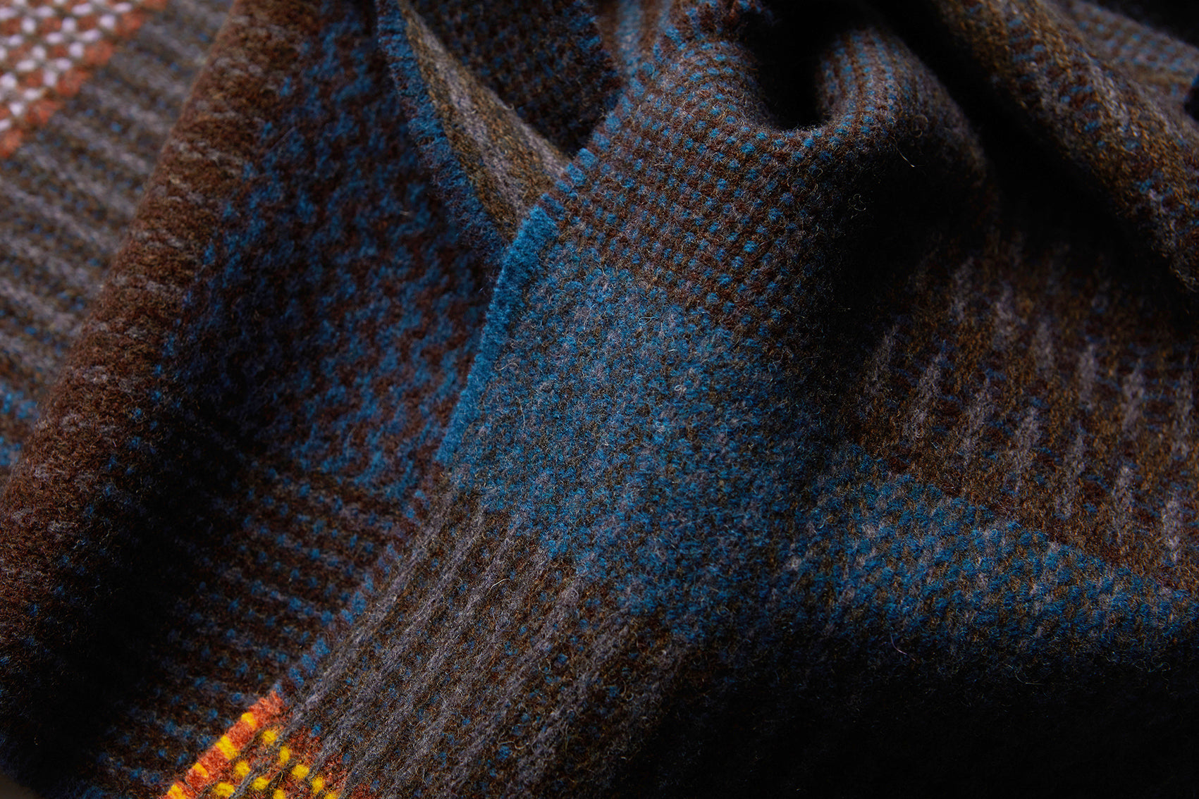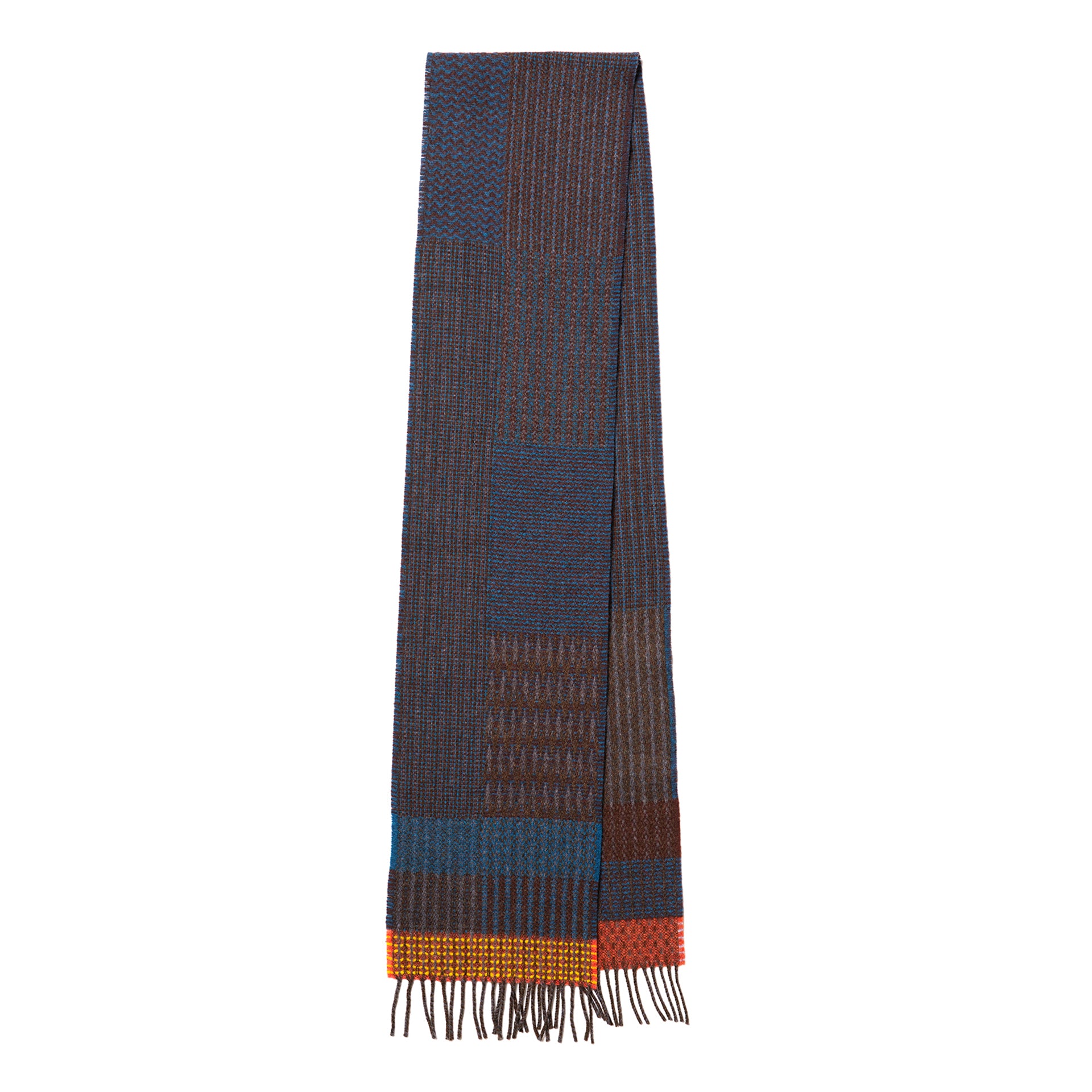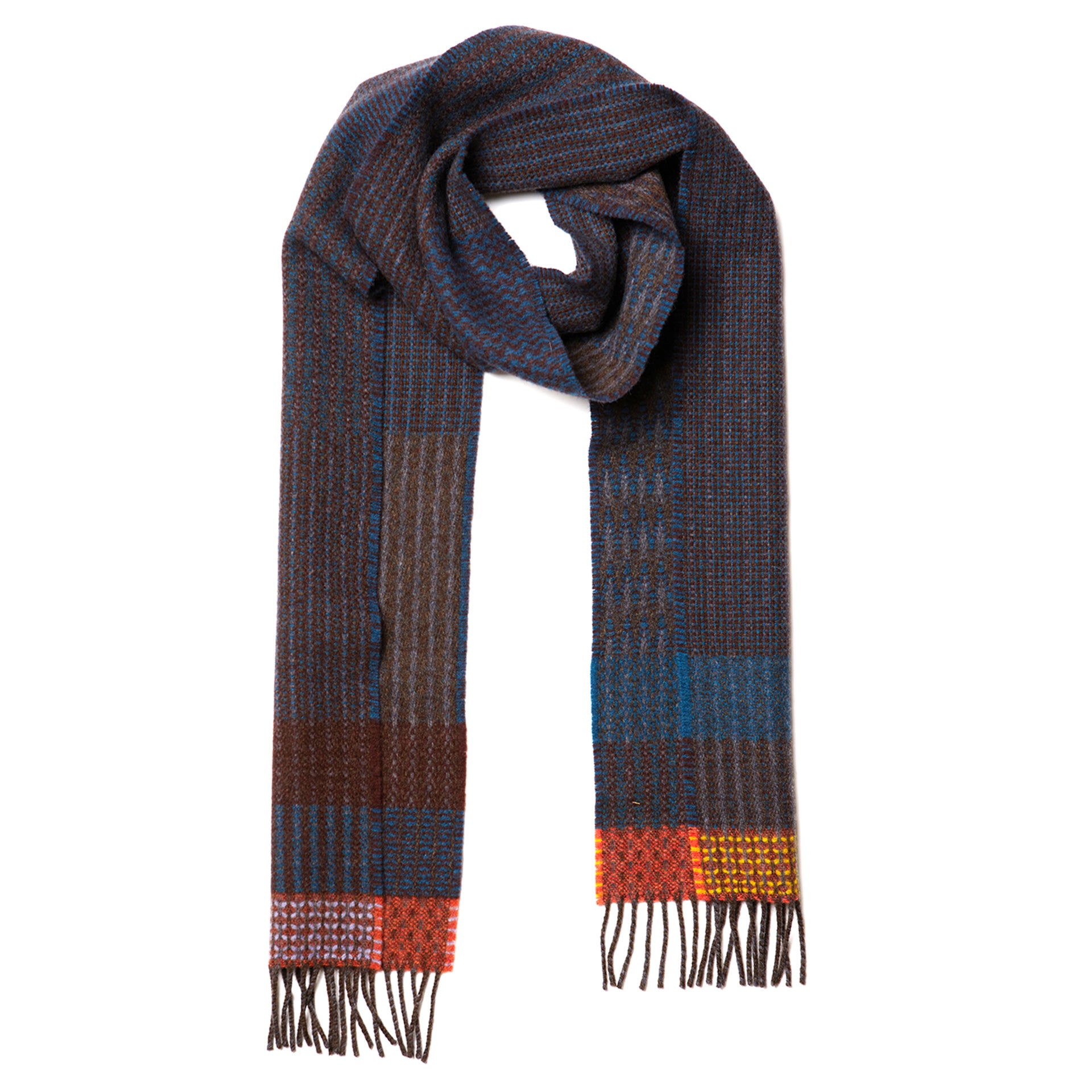 With all over patterning, this merino lambswool scarf is woven with just four main colours and various weaves to create a patchwork of textures.