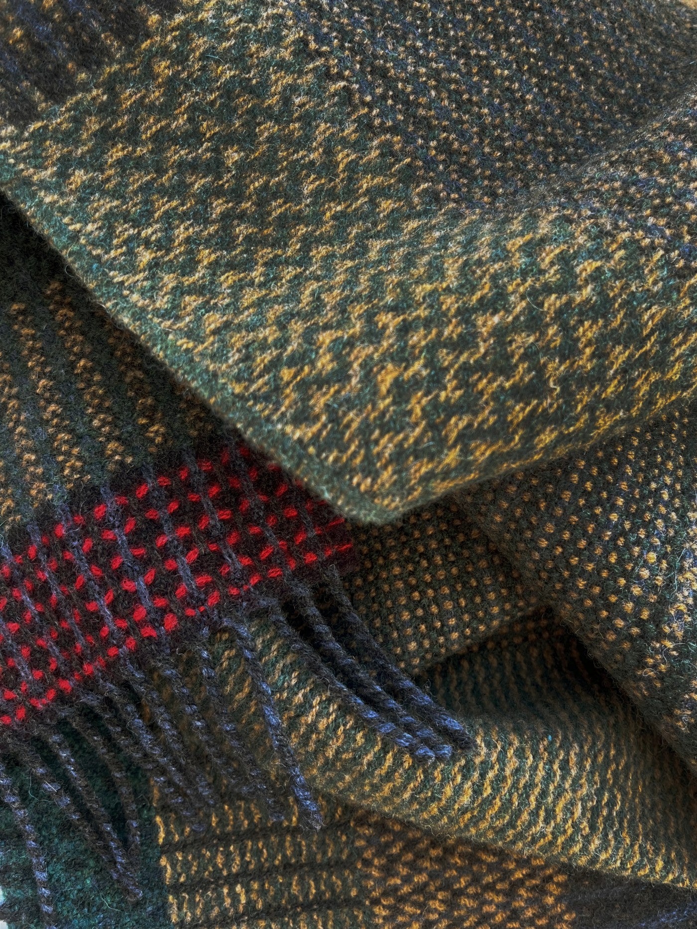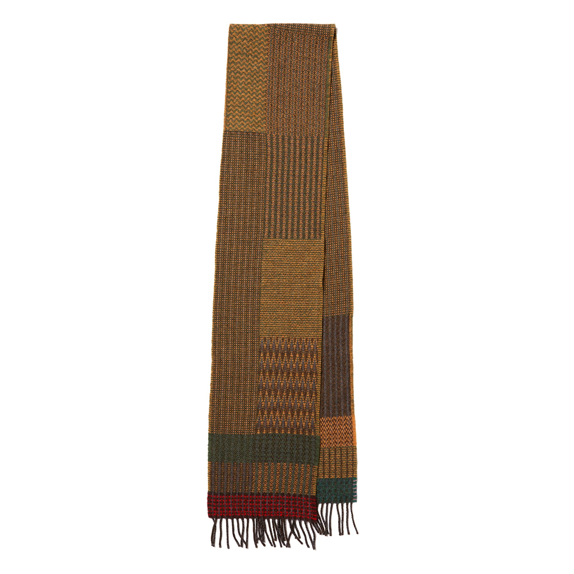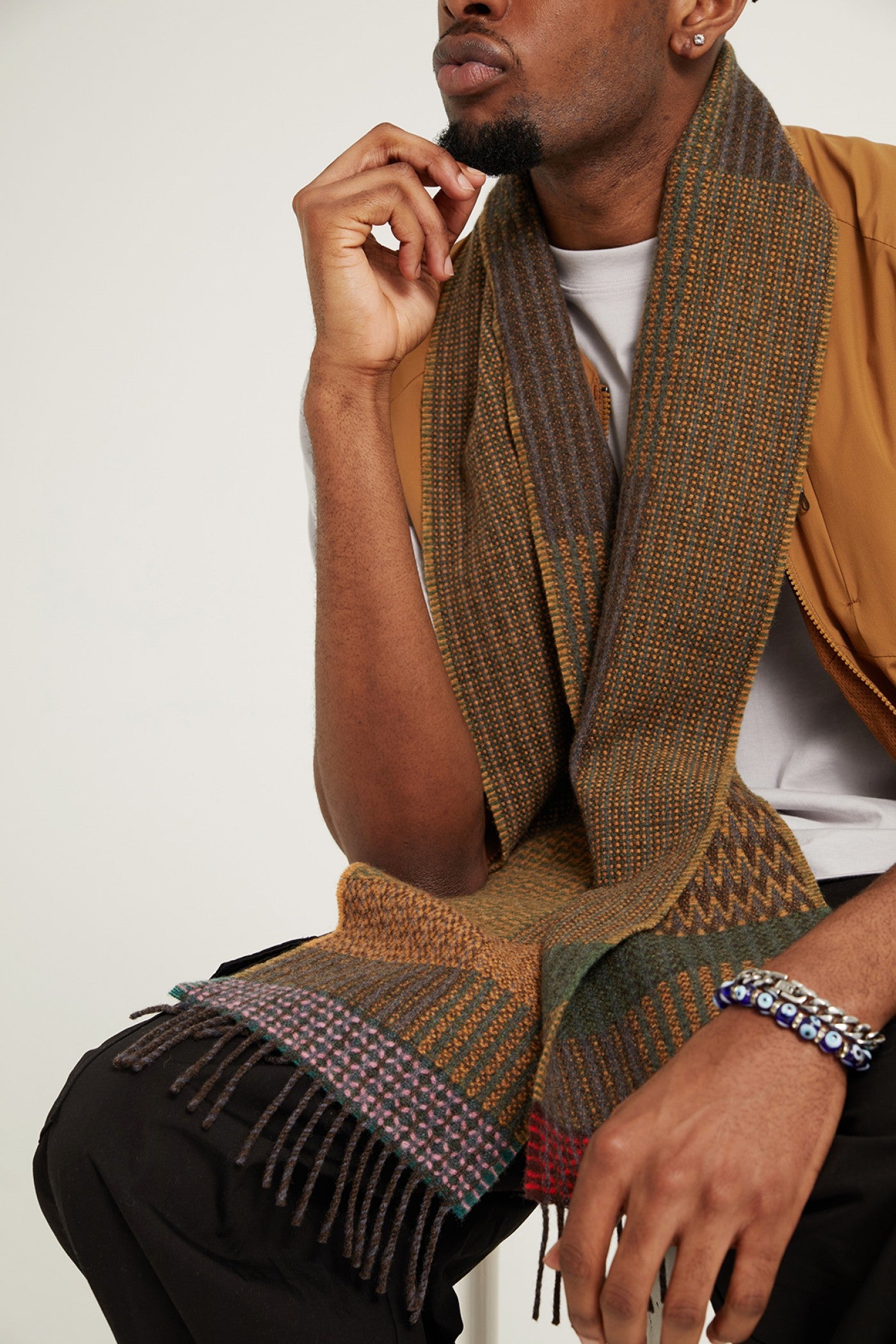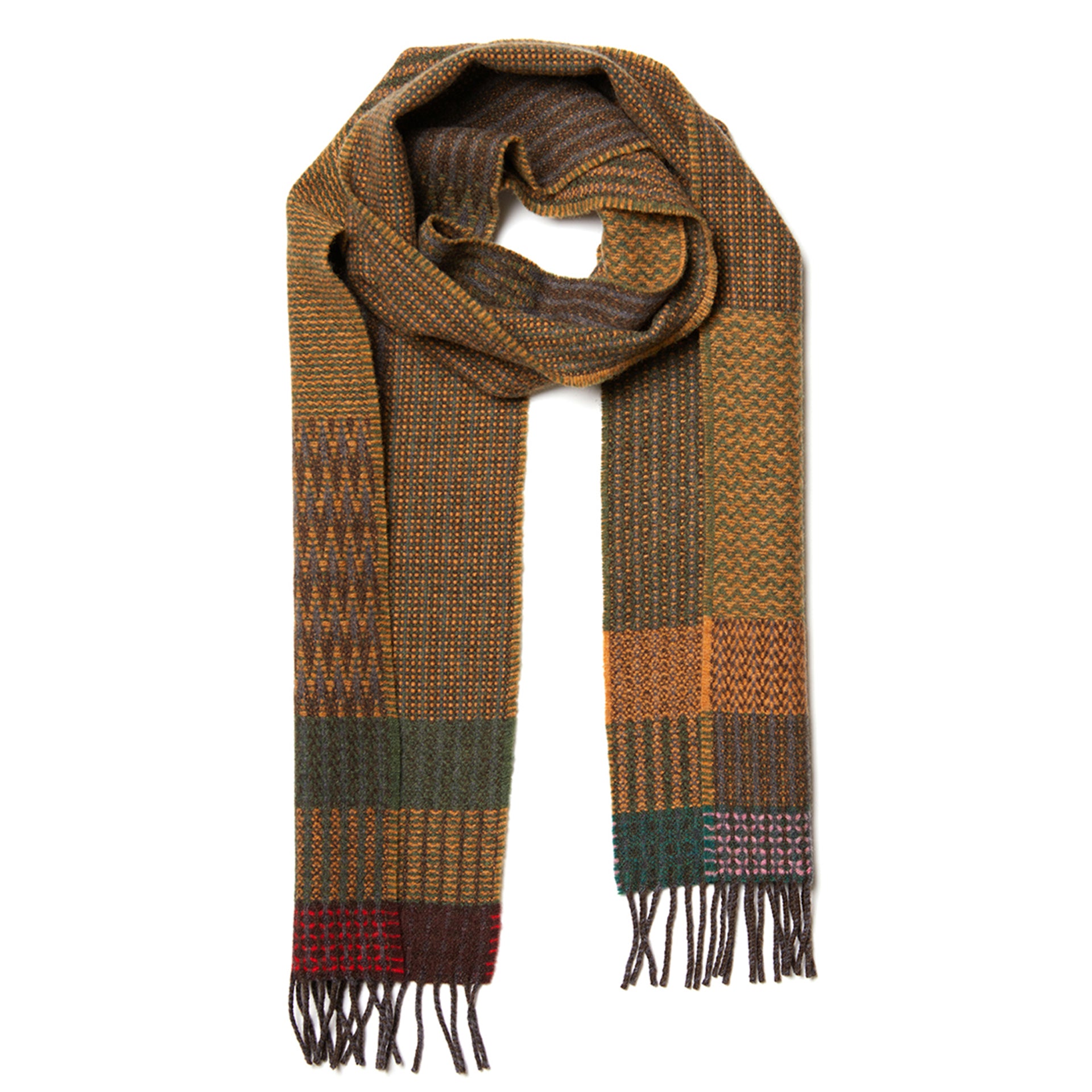 With all over patterning, this merino lambswool scarf is woven with just four main colours and various weaves to create a patchwork of textures.