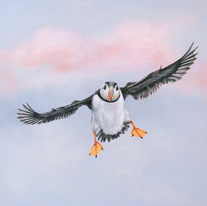 This limited edition print of an original pastel pencil artwork, beautifully captures a puffin in mid-flight against a soft, pastel-coloured sky.