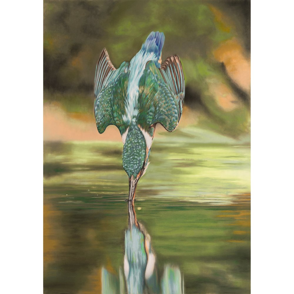 A vibrant scene where a resplendent kingfisher is captured in a moment of sheer precision. The kingfisher’s sleek form is angled back in a step dive, it’s beak, a slender dagger, pierces the calm surface of the water.