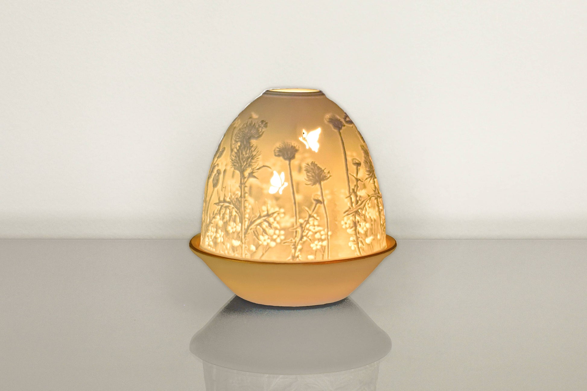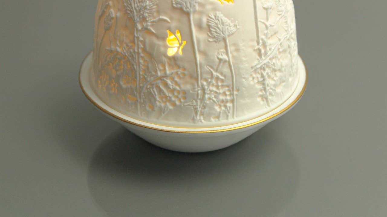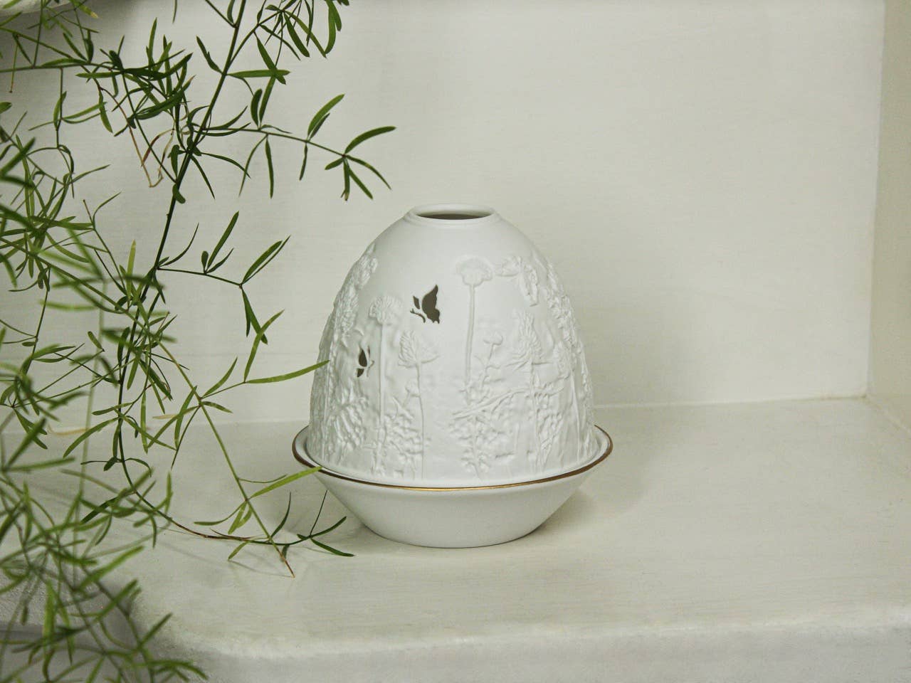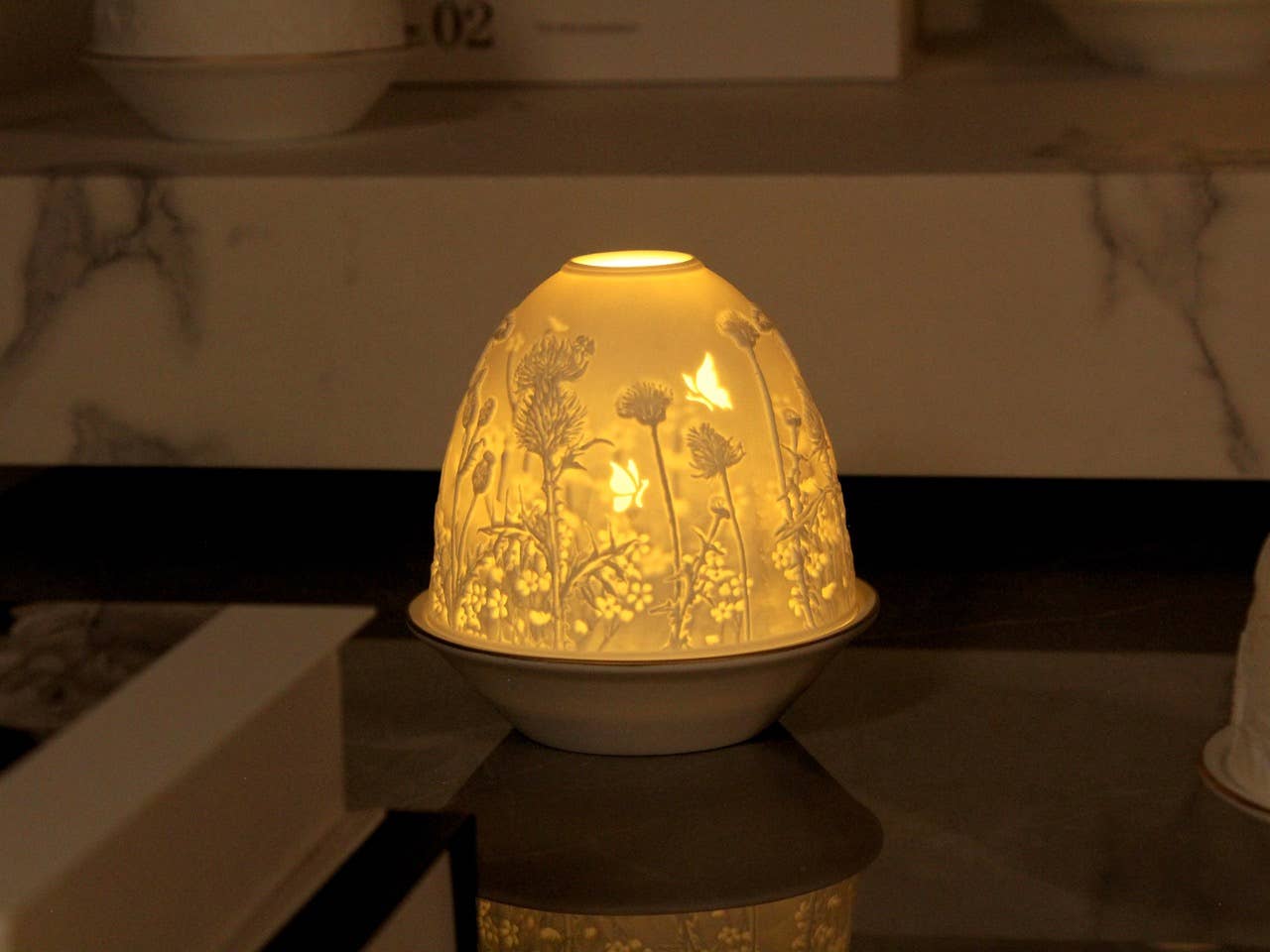 Add a touch of elegance to your space with this delicate porcelain tealight holder. Featuring intricate Lithopane designs, it casts beautiful shadows when lit, creating a cosy and inviting atmosphere.