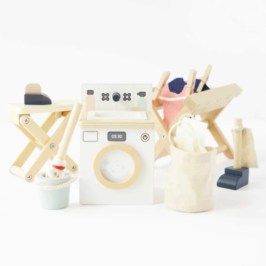 Scrub a dub dub. Washing tiny clothes just got a whole lot more fun with the sweetest laundry room set. Crafted from wood, this delightful 17 piece toy and makes a wonderful addition to small world play.