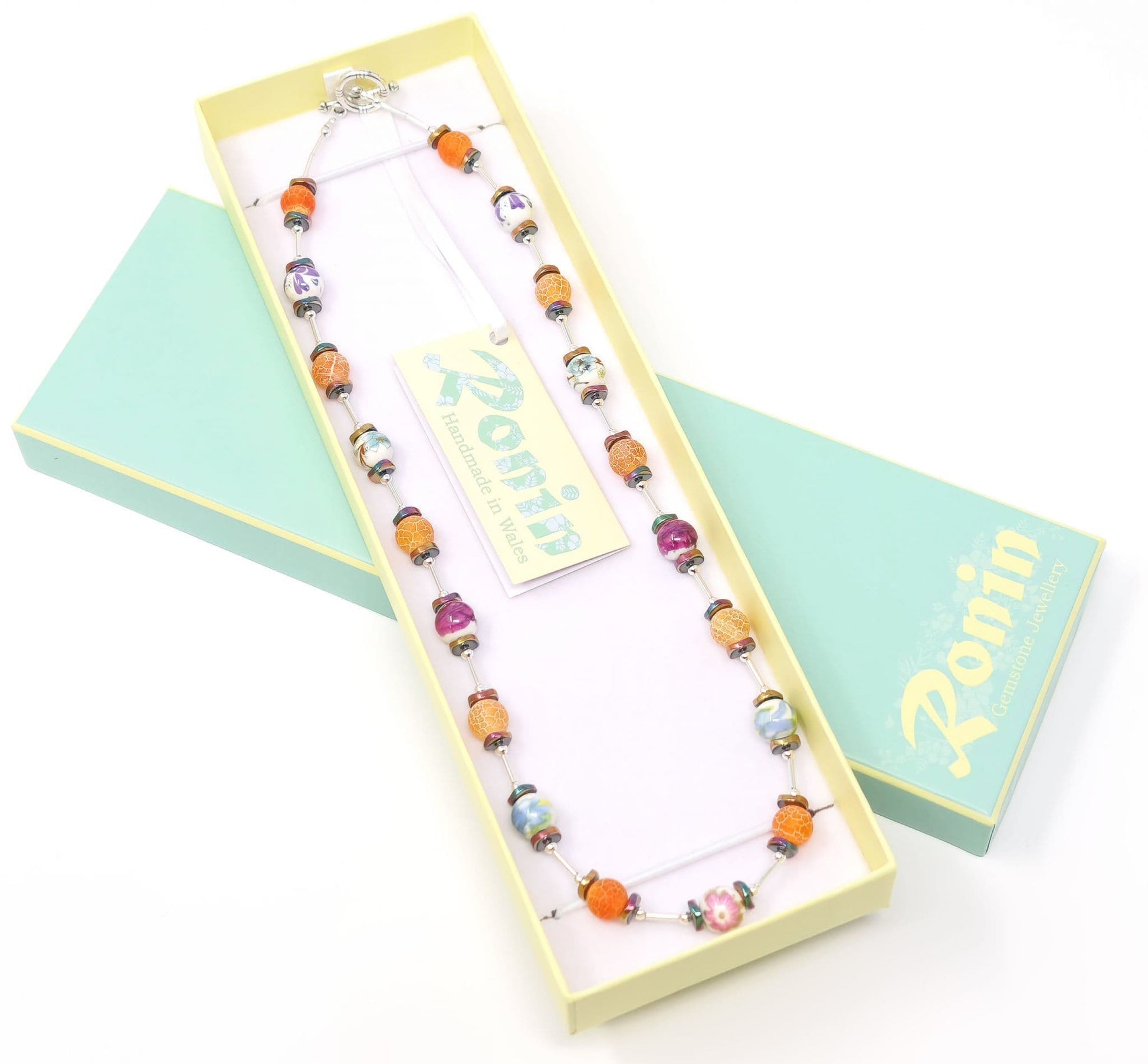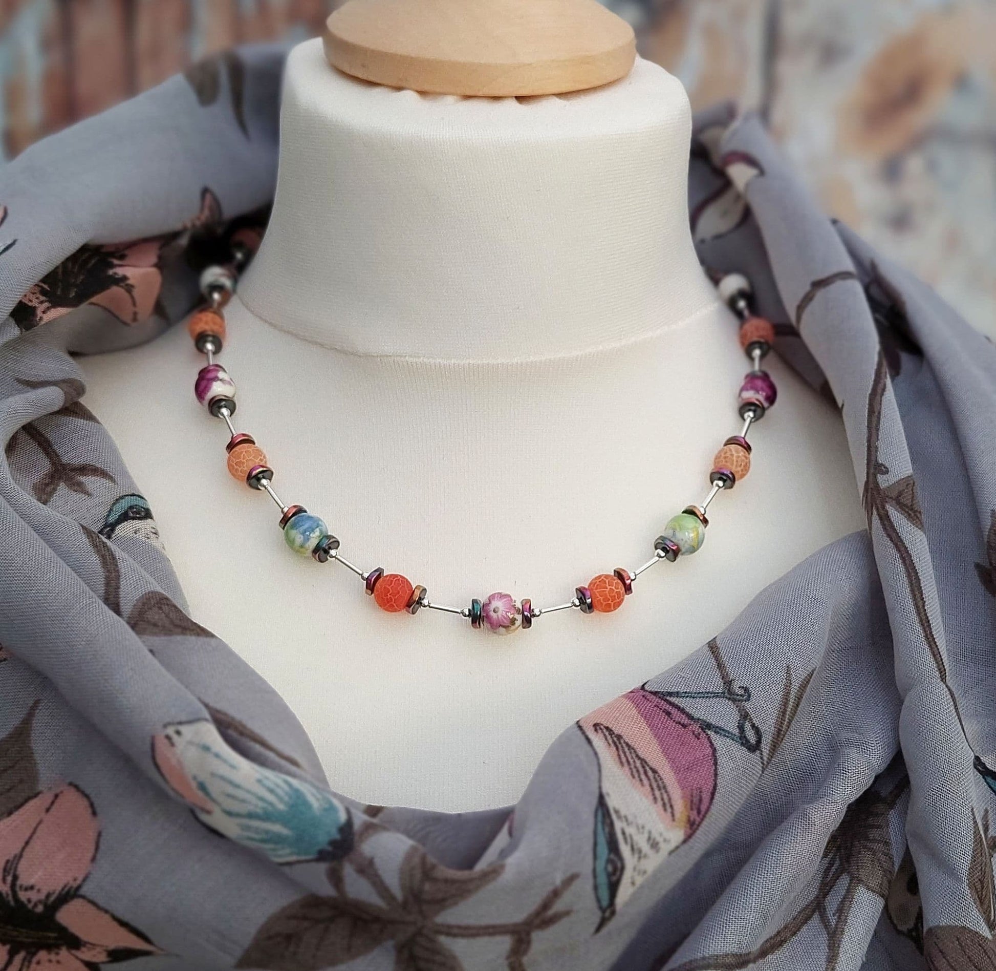 Decorative porcelain beads are combined with matt Agate gemstones. Haematite beads are also used.