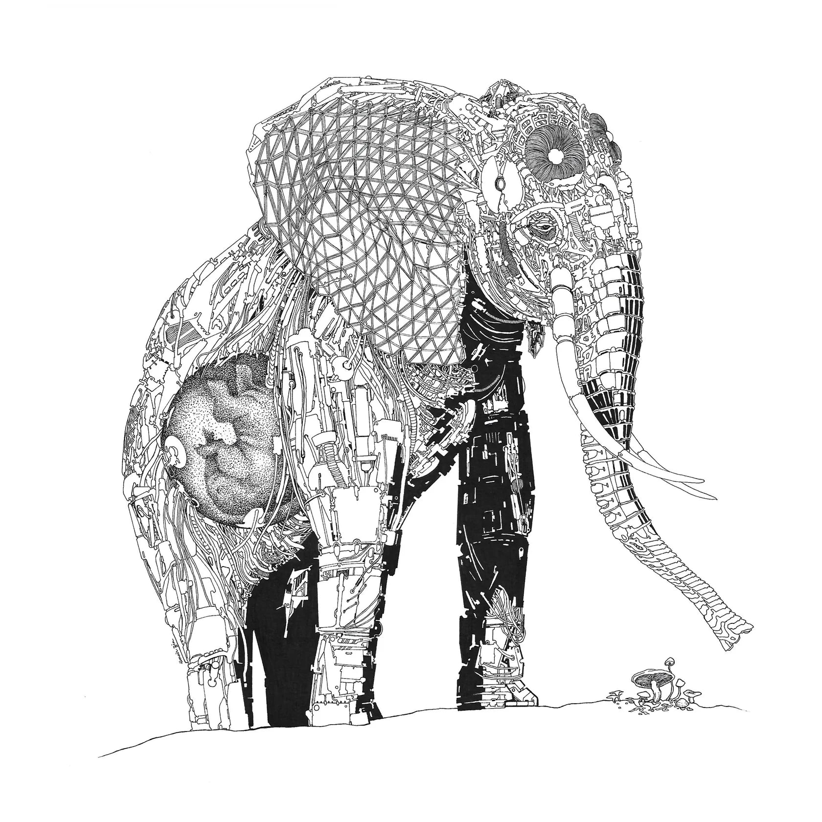An original permanent ink drawing on art paper by Umair Zia emotionally draws on a pregnant elephant mourning the loss of the calf’s father.