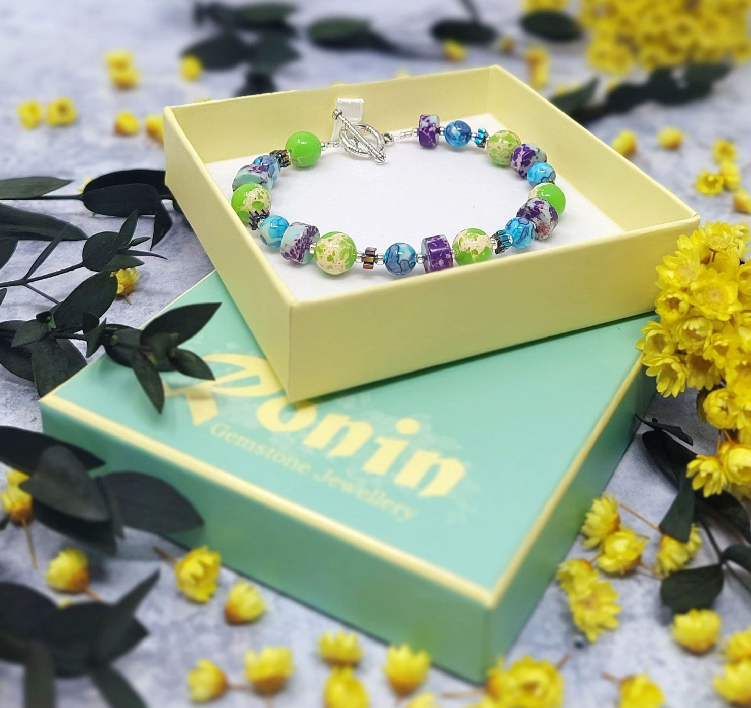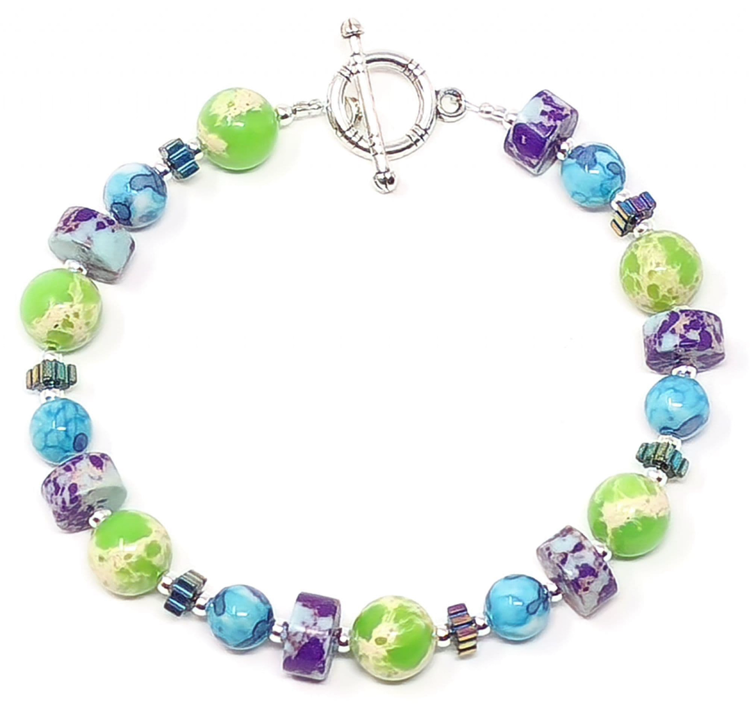 Vivid green patterned Impression Jasper gemstone beads are combined with purple and blue patterned gemstones, along with small Haematite beads.
