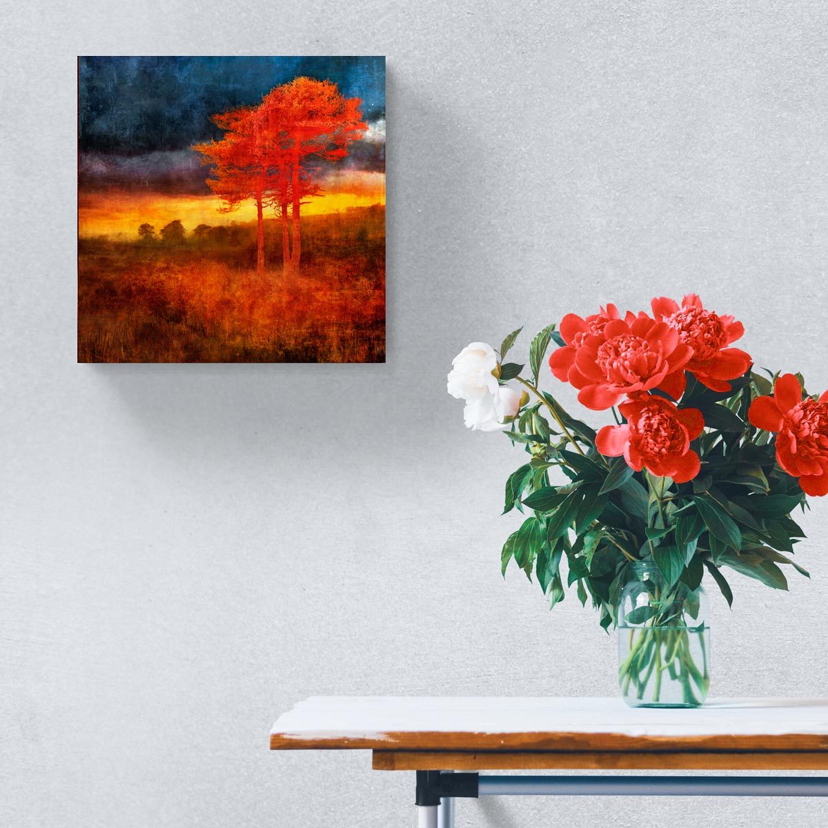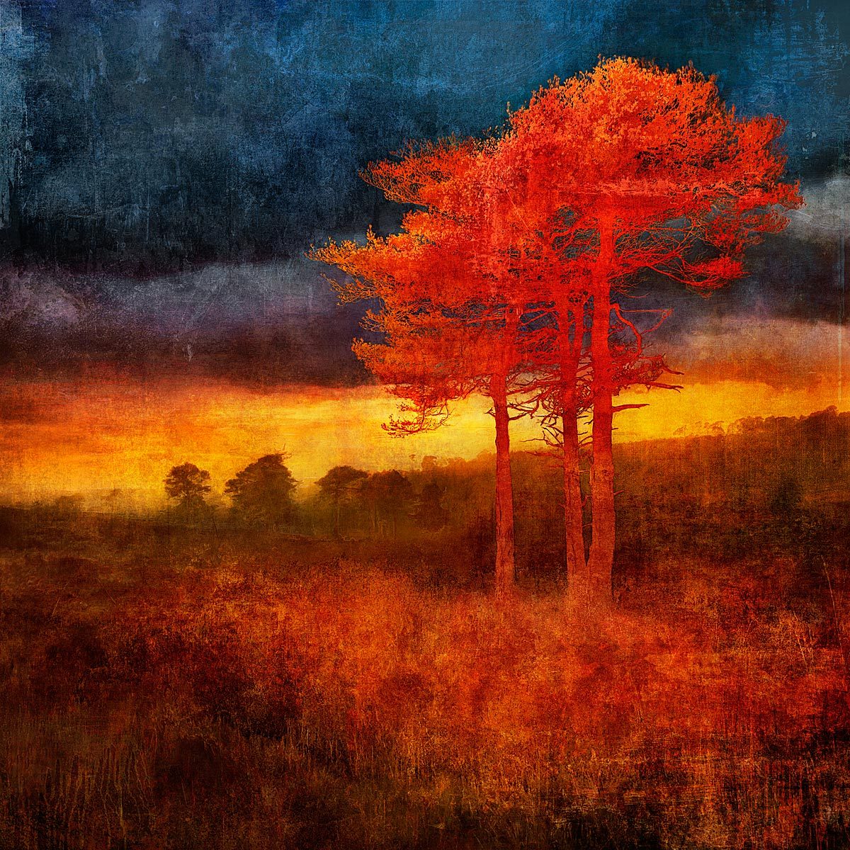 A small clump of trees are highlighted in hot vivid colours against a stormy deep blue sky as it rolls across the Ashdown Forest (Sussex, England) at dusk.