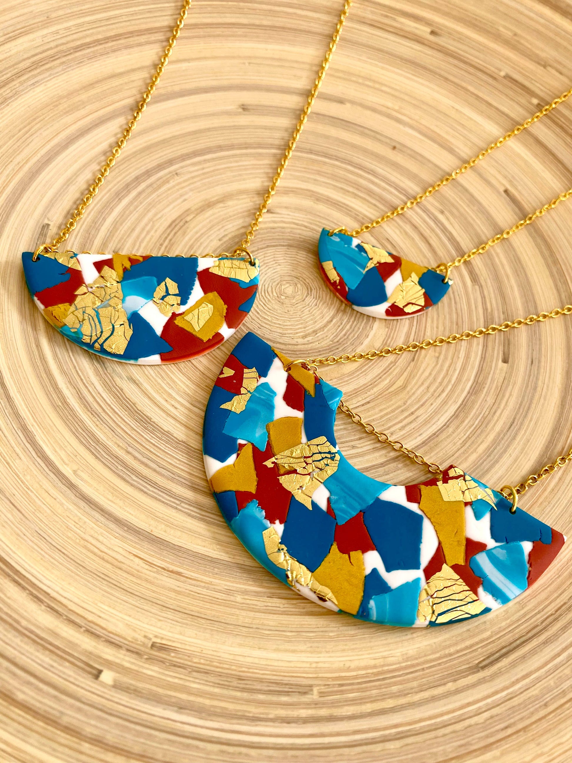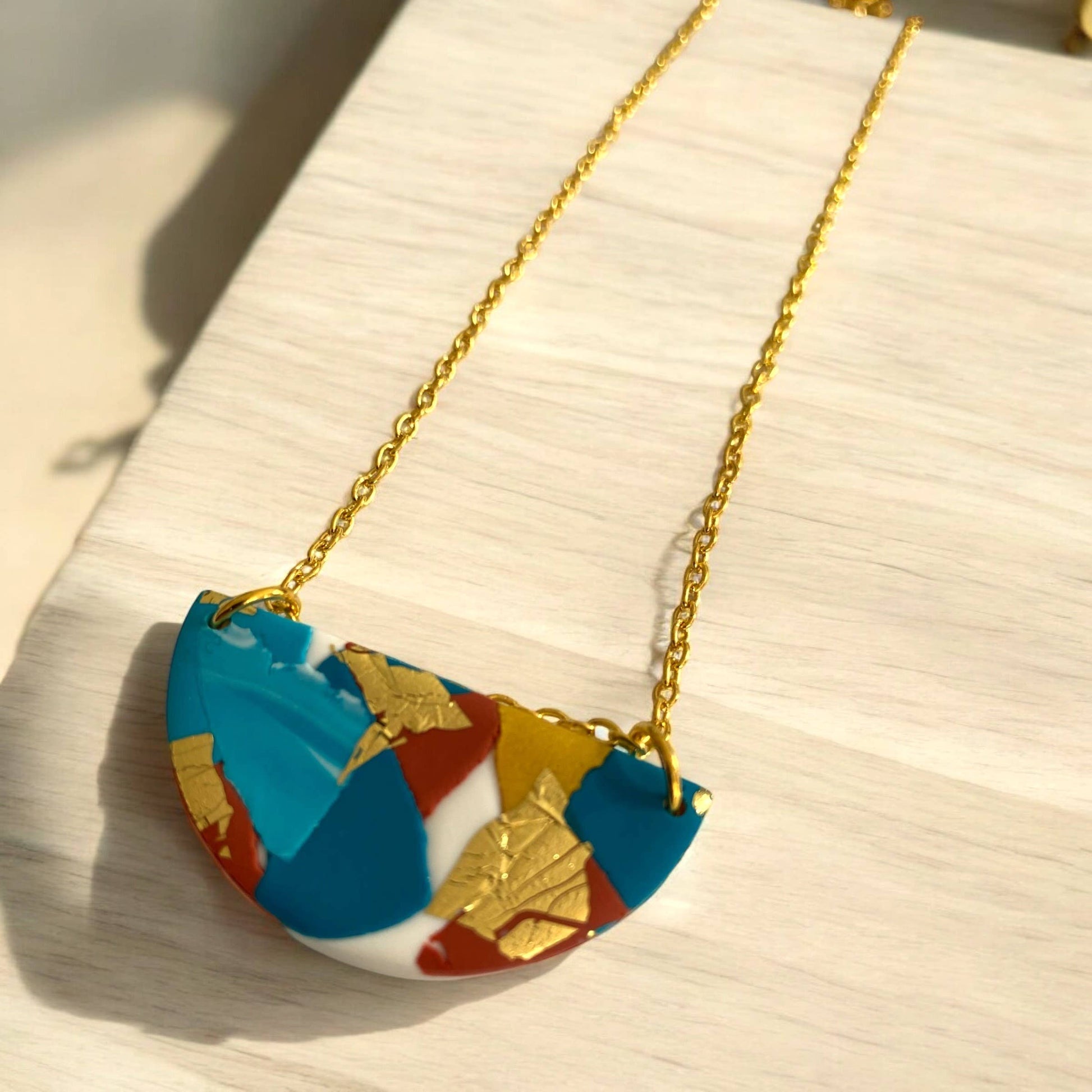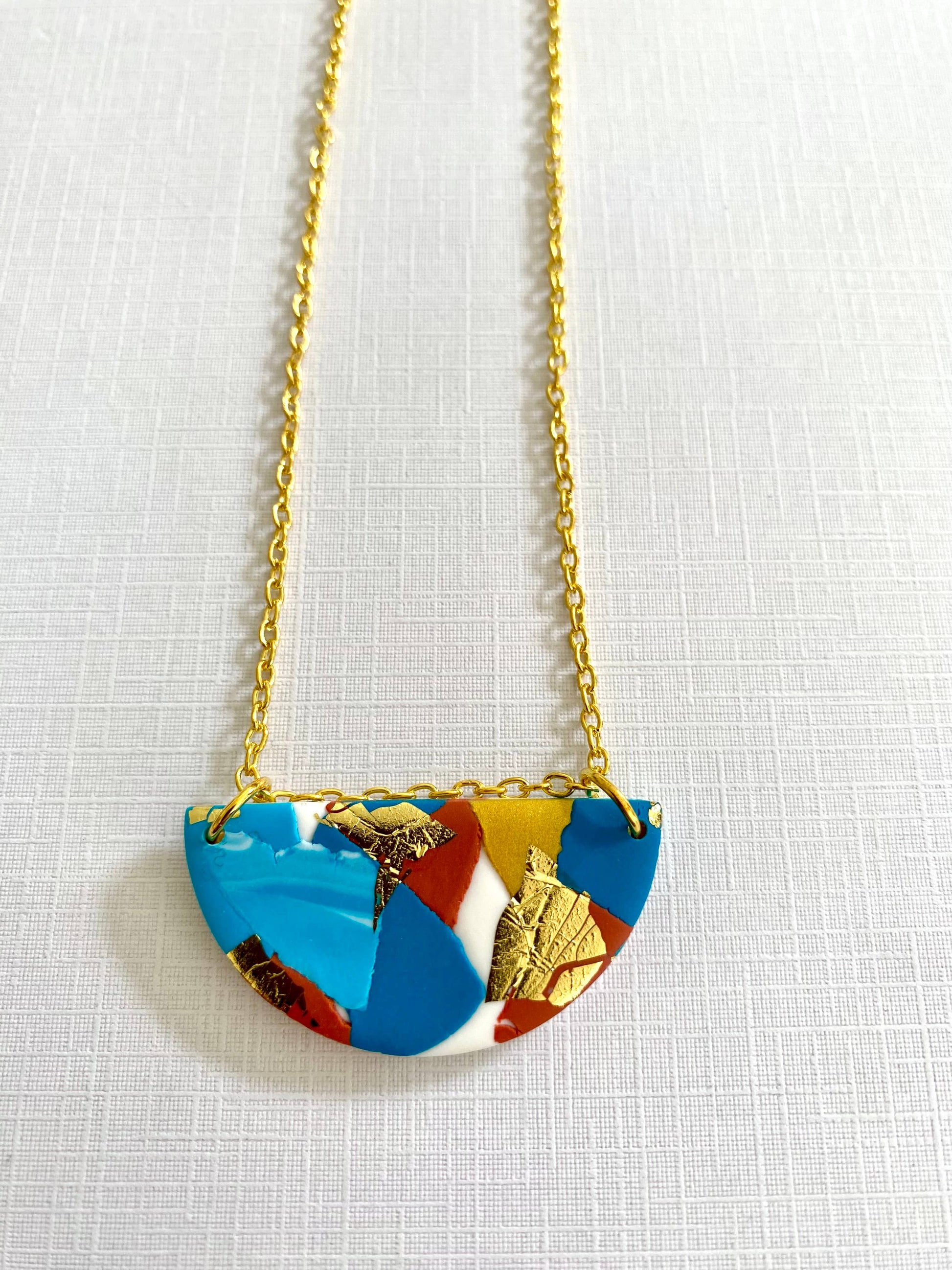 Handmade polymer clay necklace with gold leaf. No two pieces are ever exactly the same as they are all cut from a large designed piece of clay.