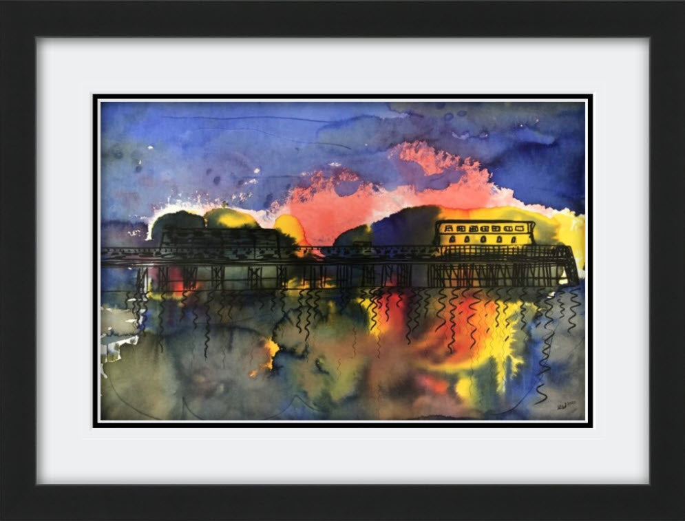 The artwork, a dance of dark and bright, A glinting pier in the fading light.