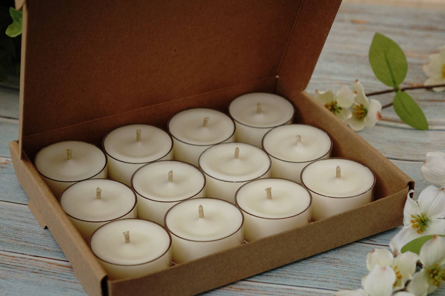 Product Description: Experience the pure ambiance of our unscented natural soy wax tealight candles. This set includes 12 tealights, each featuring a cotton wick for a clean, even burn. The candles are hand-poured into recyclable cups, ensuring both quality and sustainability.