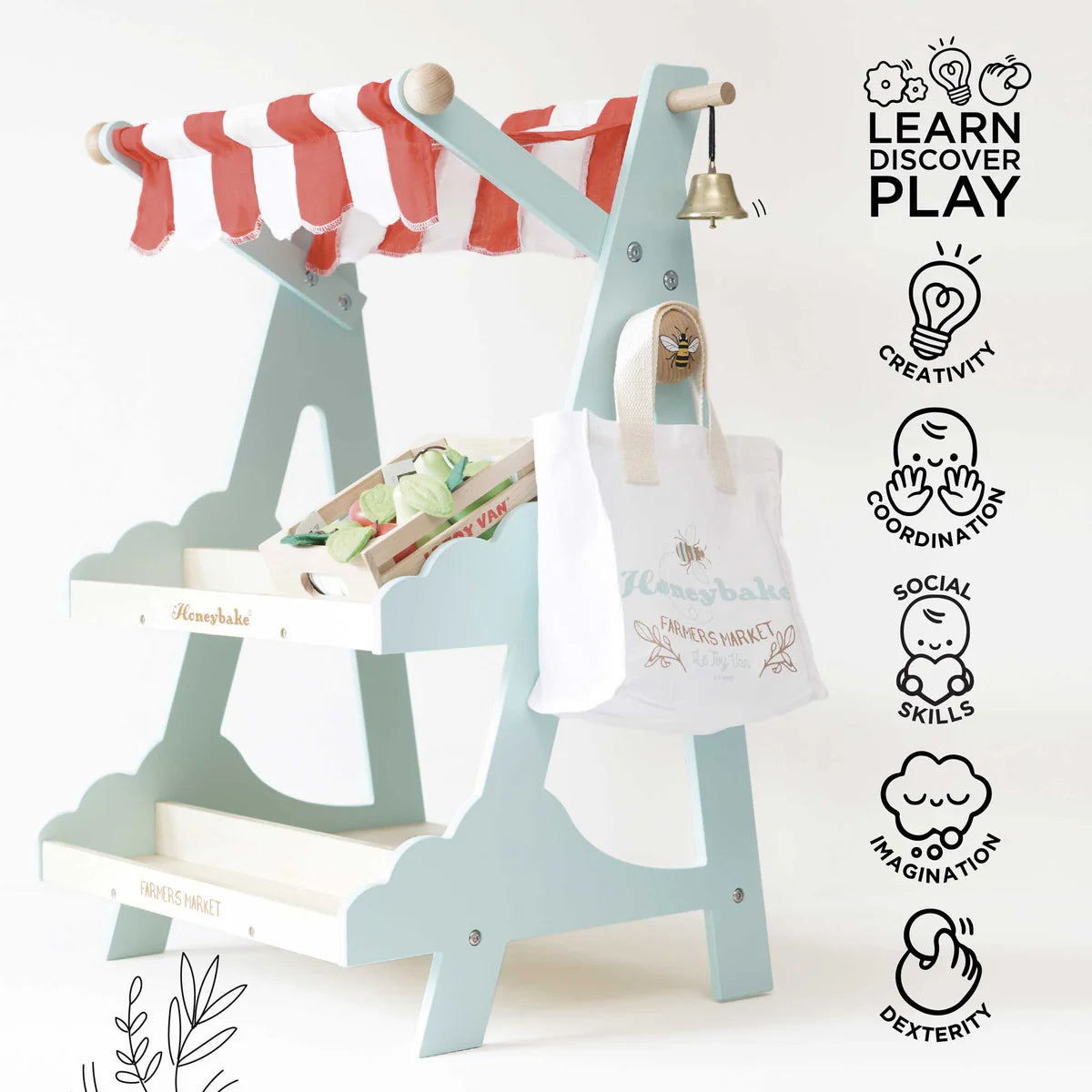 Featuring a fabric shopping bag, apple's and pears crate, & bell for customers to ring for attention.