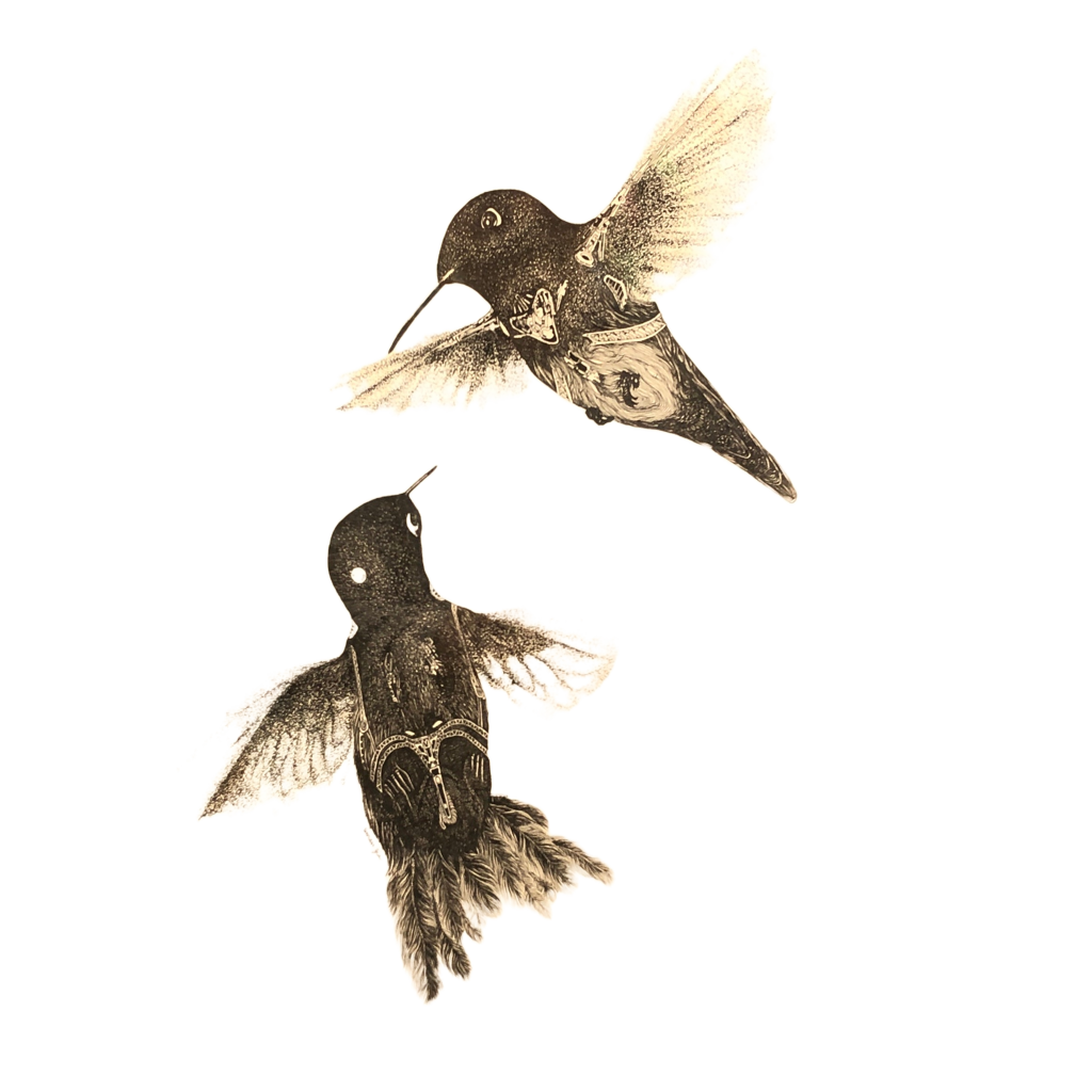 An original permanent ink drawing on art paper by Umair Zia depicts two humming birds in an evolutionary delicate dance between nature and mechanics.