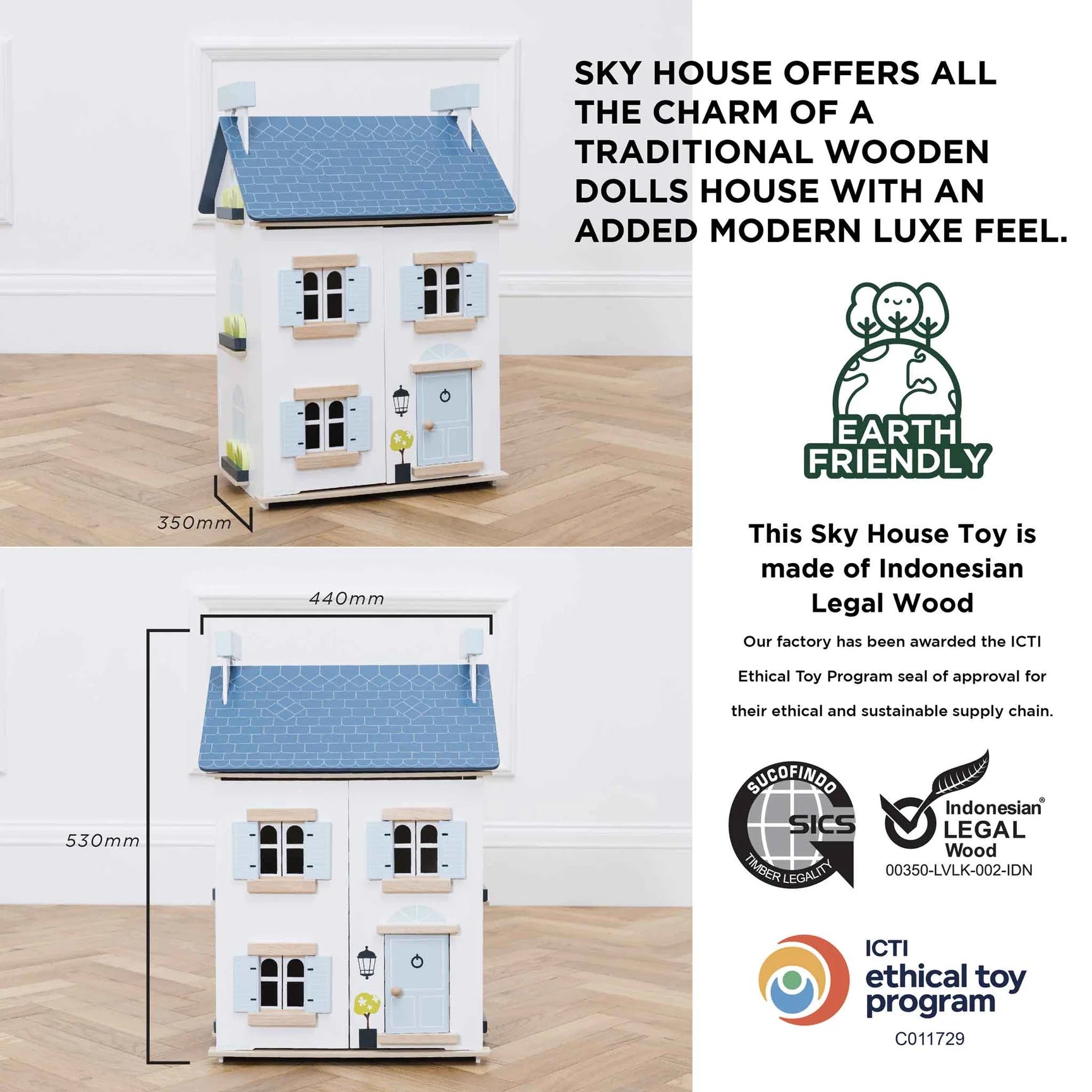 Sky House offers all the charm of a traditional wooden dolls house with an added modern luxe feel.