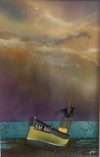 This artwork shows SM444, a yellow fishing boat resting on Worthing’s shingle beach.