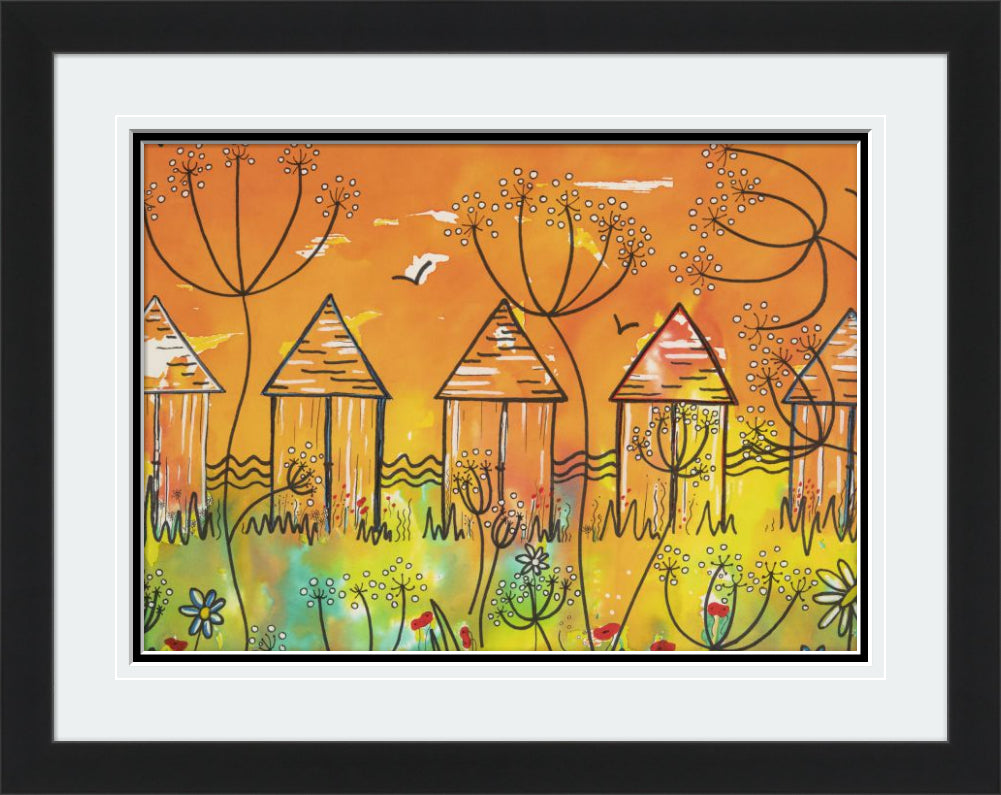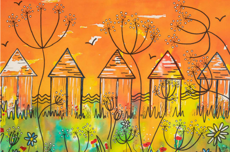 In the glow of the day’s last light, “Sunset Beach Huts” come into sight.