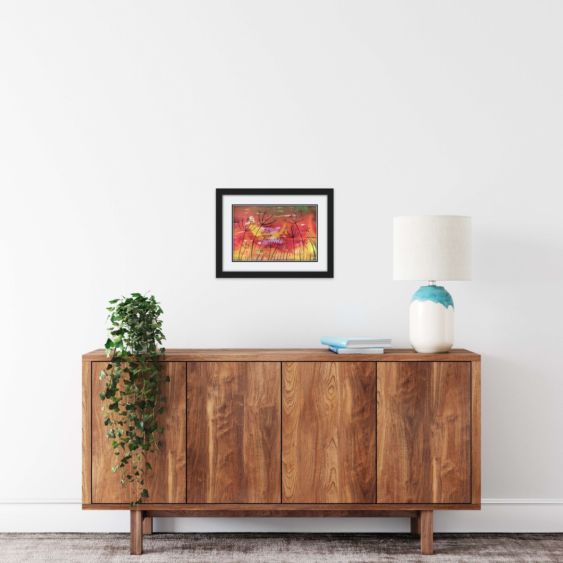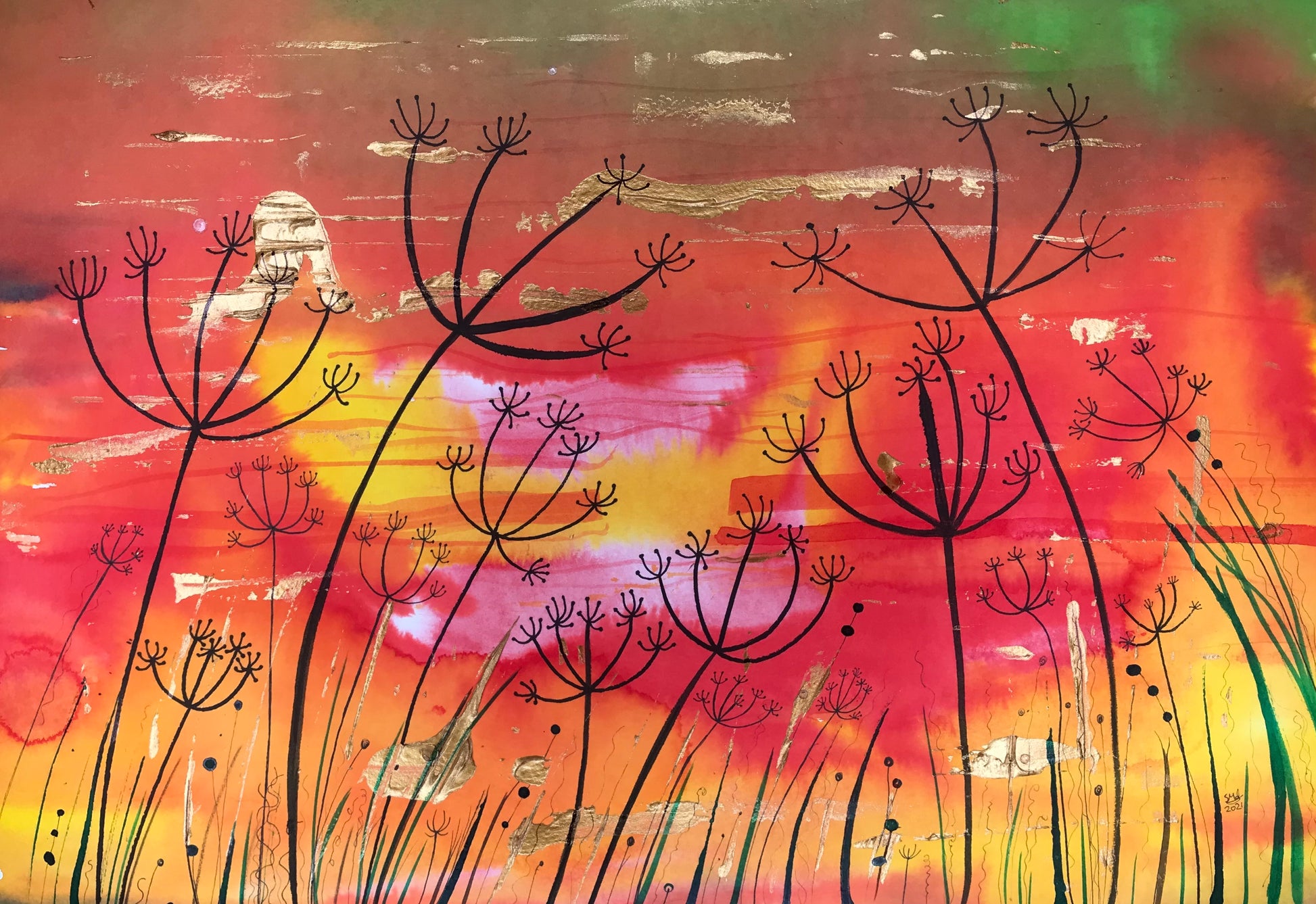 Ink on paper, black against the red, A dance of stems, where sun has fled.
