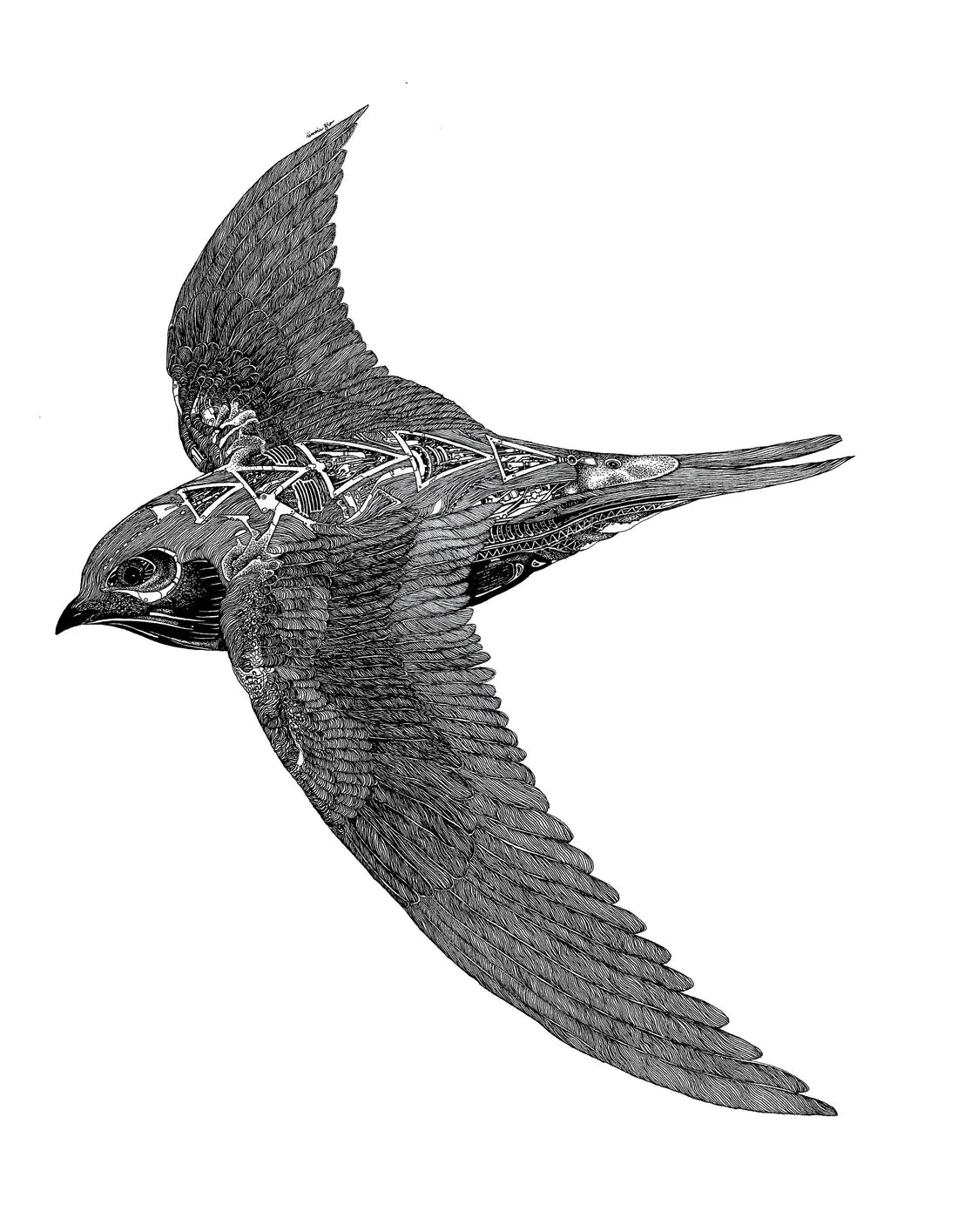 An original permanent ink drawing on art paper by Umair Zia depicts a Swift in graceful flight, a delicate dance between nature and mechanics.