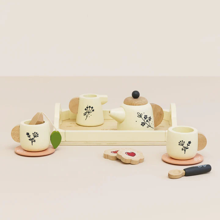 A delightful addition to any child's imaginative playtime, this wooden tea set is adorned with charming flora details and engraving, creating a whimsical and elegant aesthetic.