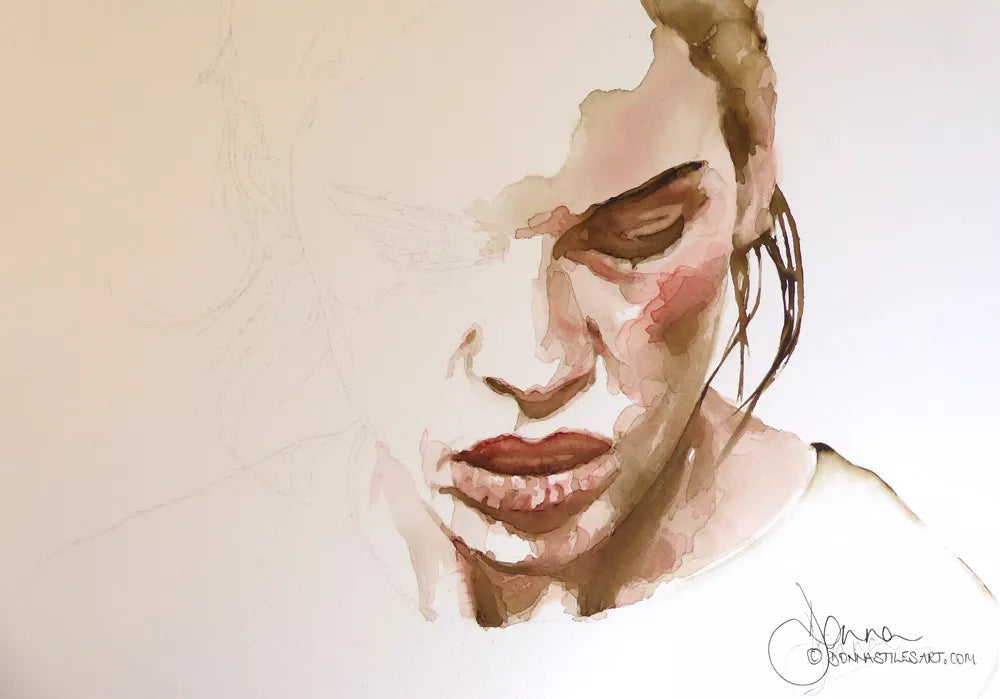 With a furrowed brow, closed eyes, and parted lips — Donna captures a moment of silent struggle. The soft, muted palette and delicate brushwork lend a quiet intensity to the piece, while the minimal background ensures the our gaze remains fixed on the raw, human expression.