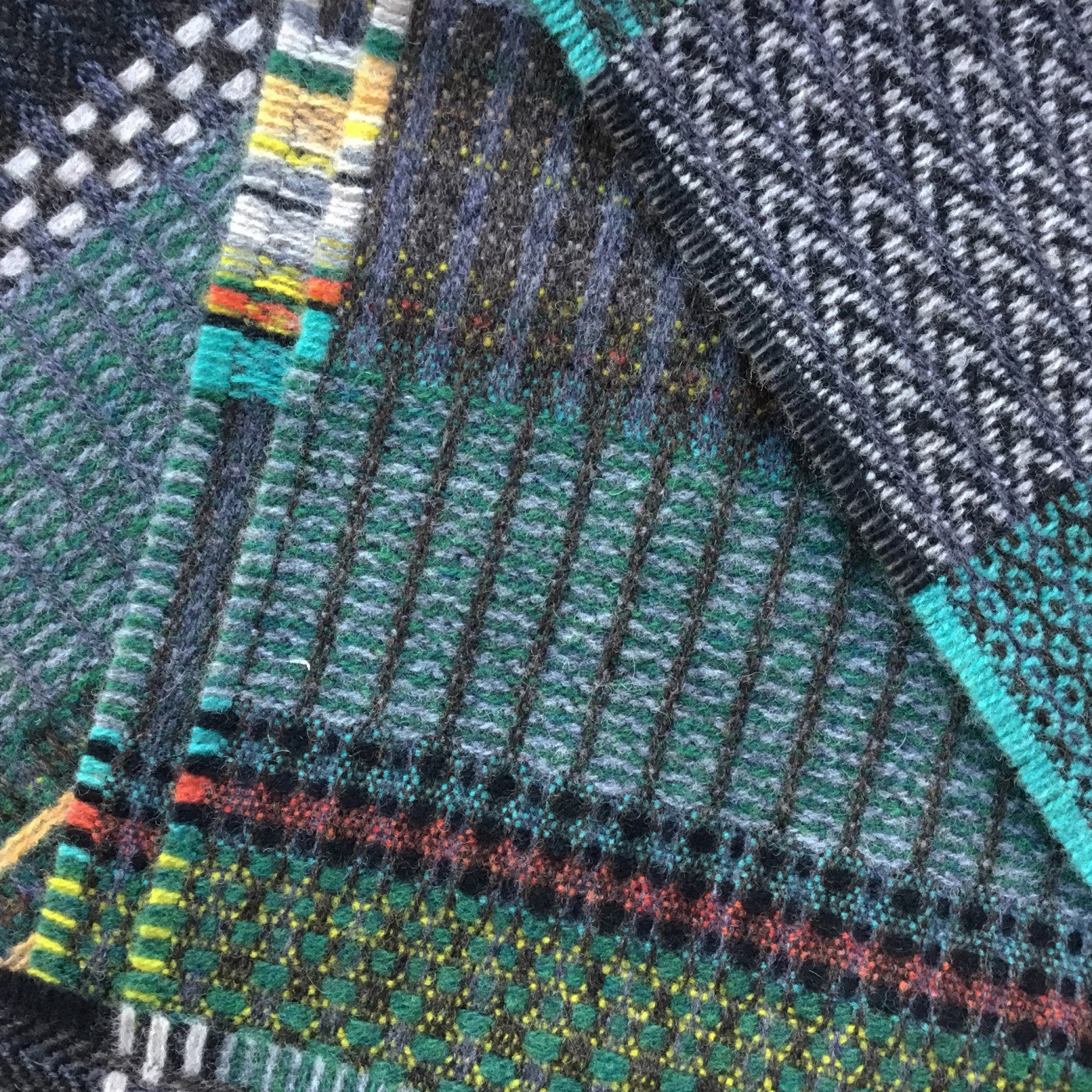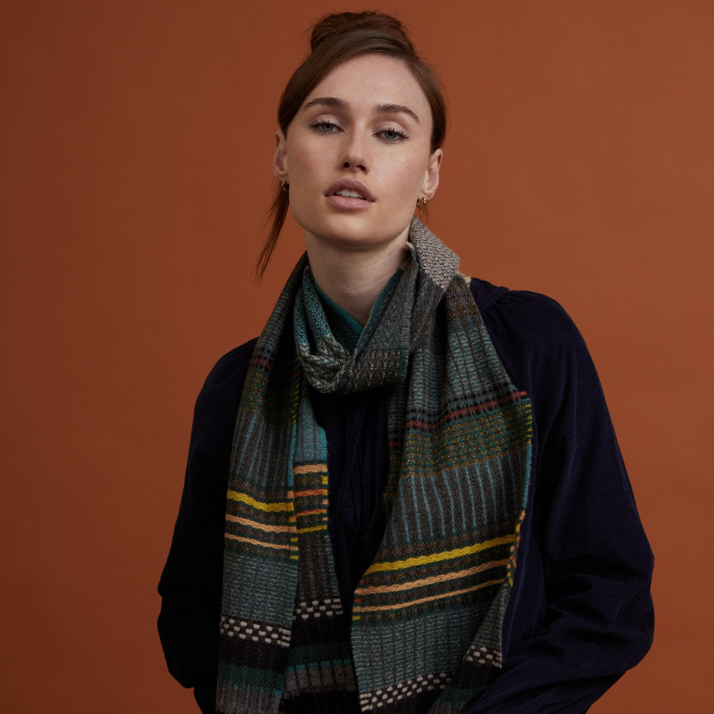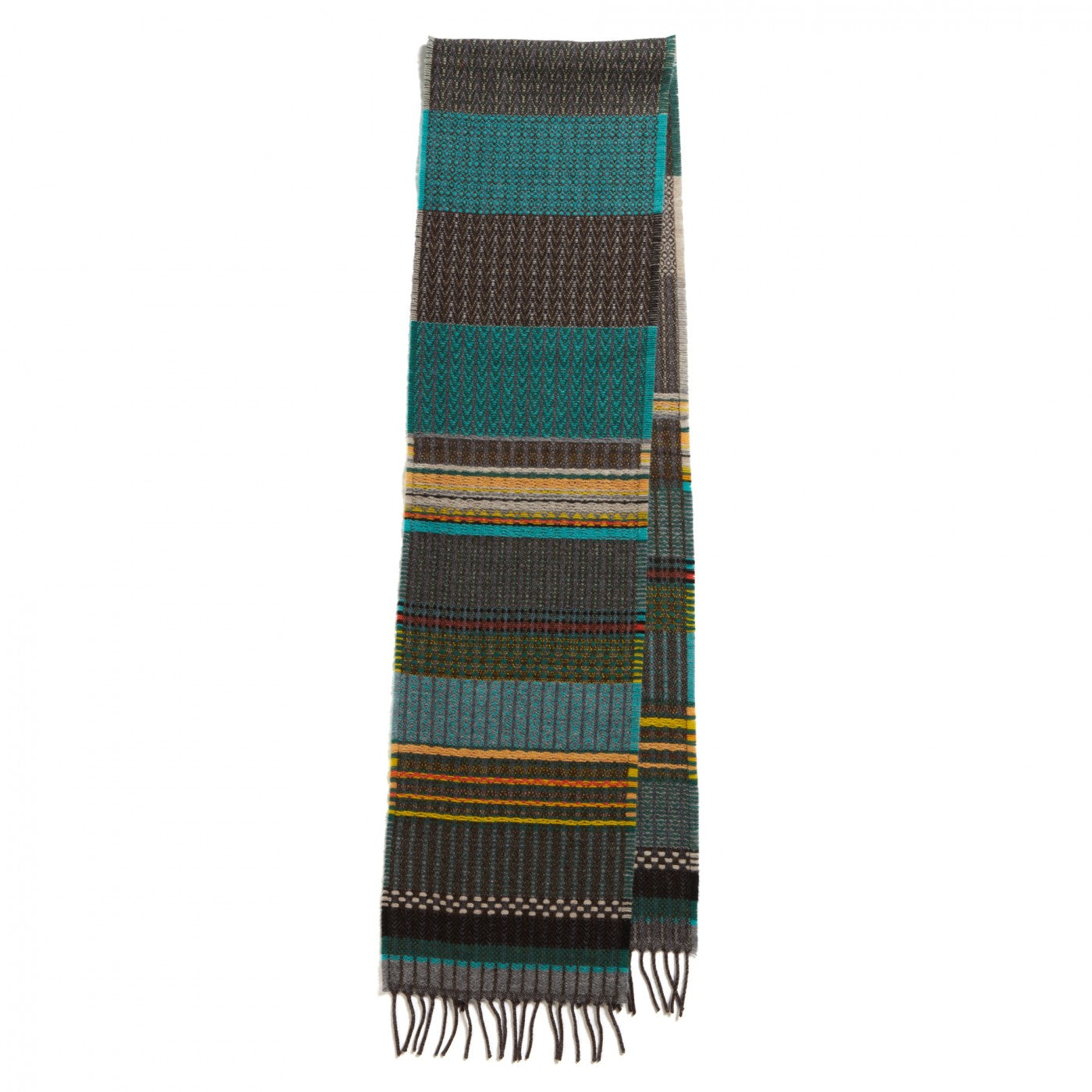 Rich, teal, turquoise, ochres and greens captured within this merino lambswool scarf reflect Florence Hutchings painting ’Cabbage bowls and vases’.